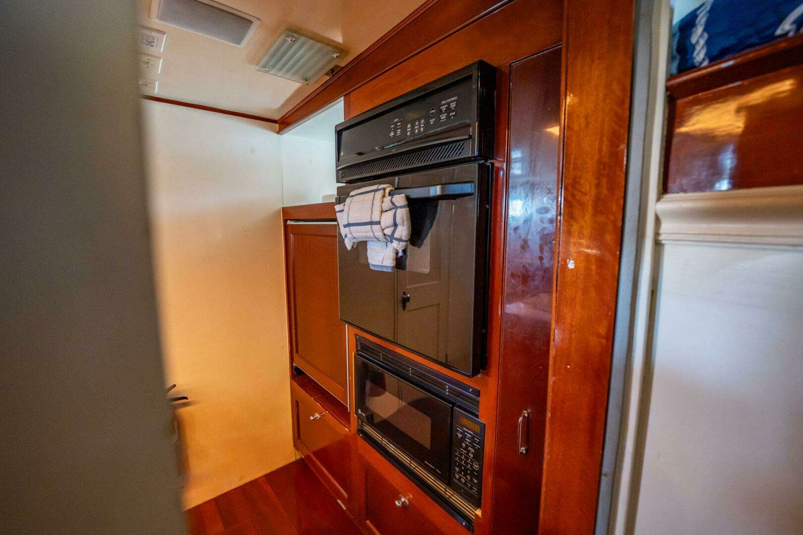 - Galley forward, down, and aft of the crew's quarters, with engine room access
