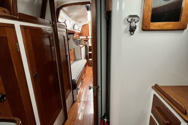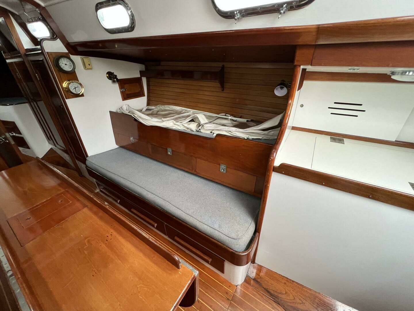 - Seating: Port and starboard pull-out transom berths, with pilot berths outboard.