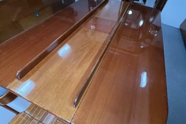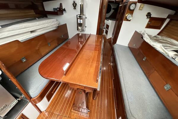 - Dining: A varnished mahogany drop-leaf table on the centerline, which houses the centerboard mechanism.