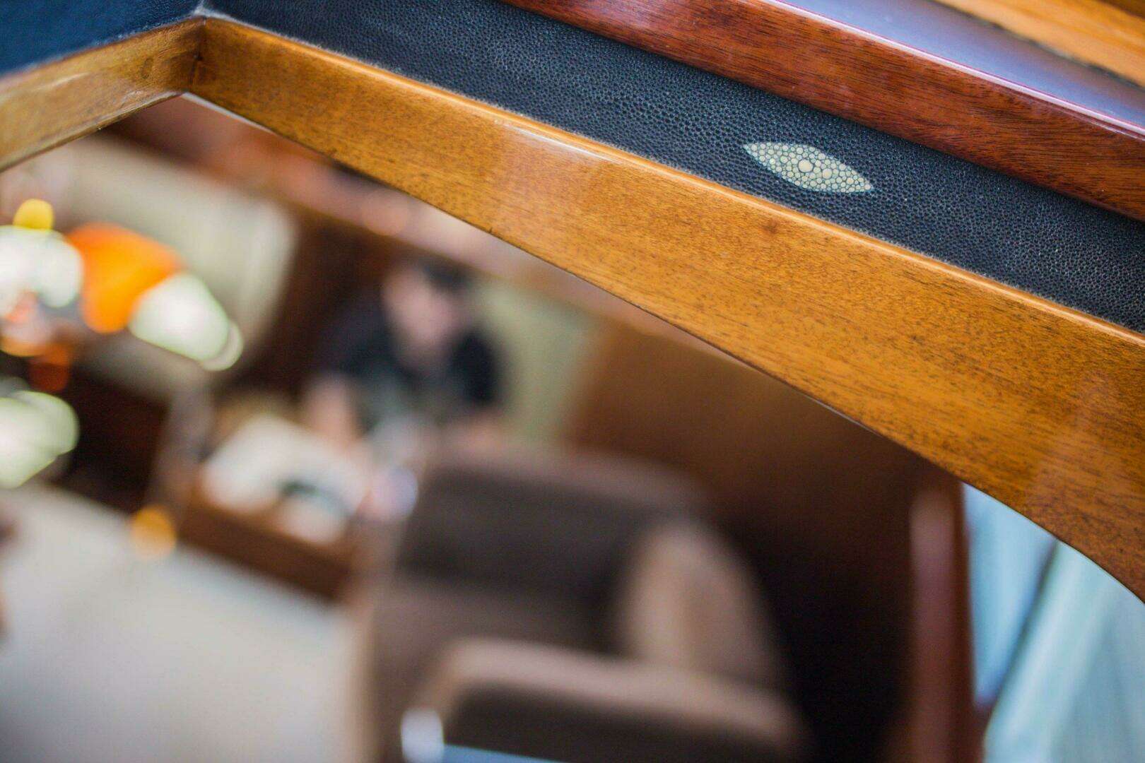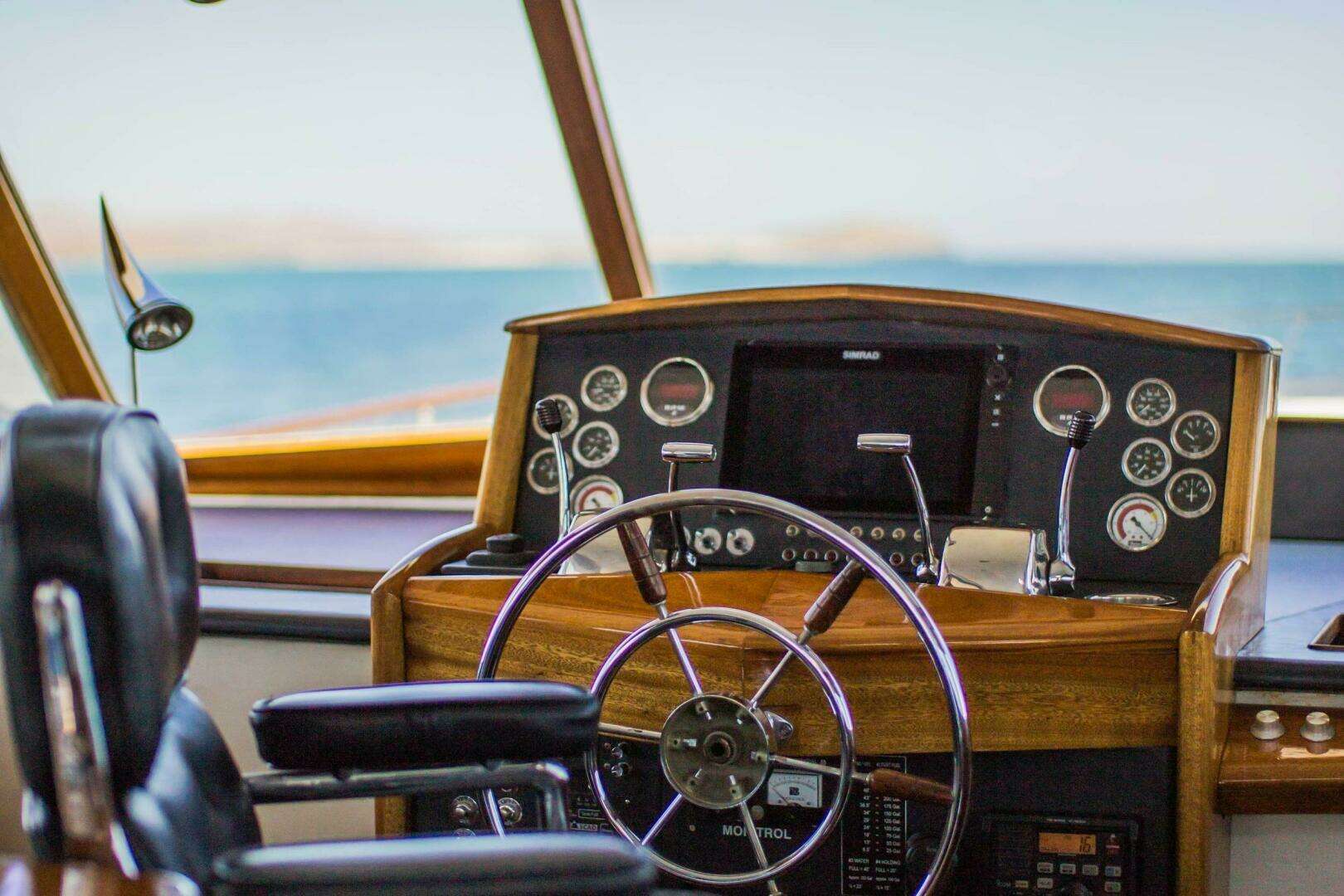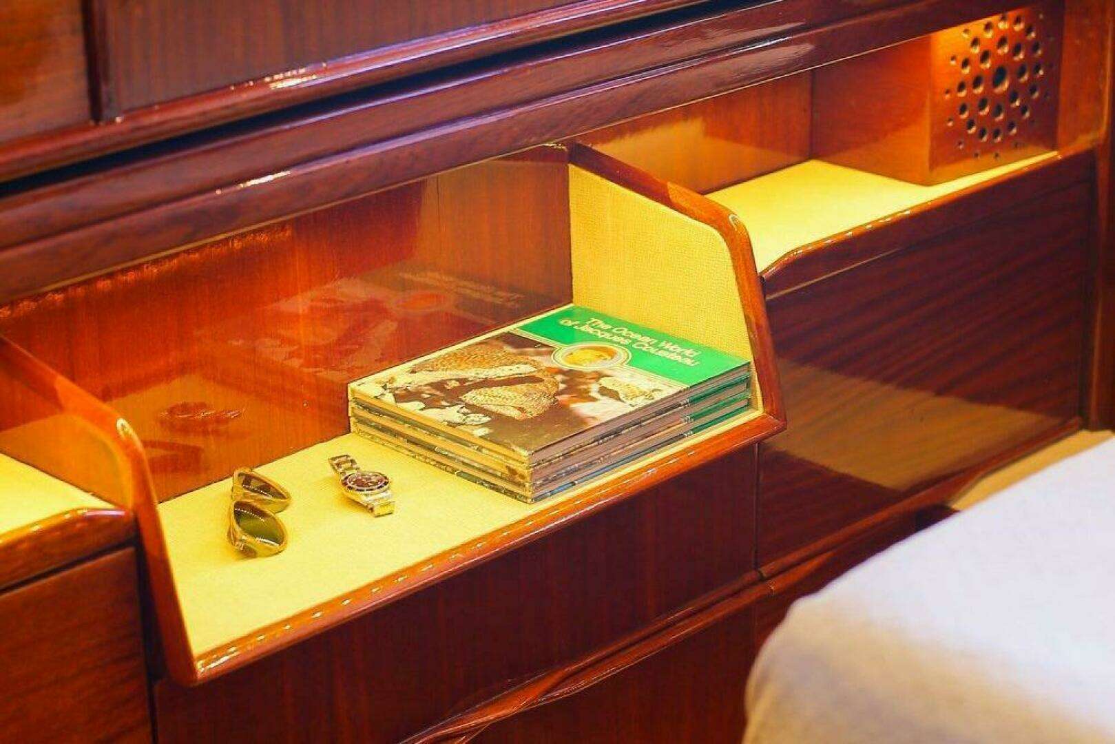 A fully remastered helm incorporates restored and vintage classical gauges and switchgear with a complete modern navionics suite. Semi-aniline leather hides line the console and frame an expansive 360 degree view around the yacht. A navy-upholstered Eames Executive Chair was adapted to serve as the captain’s perch.