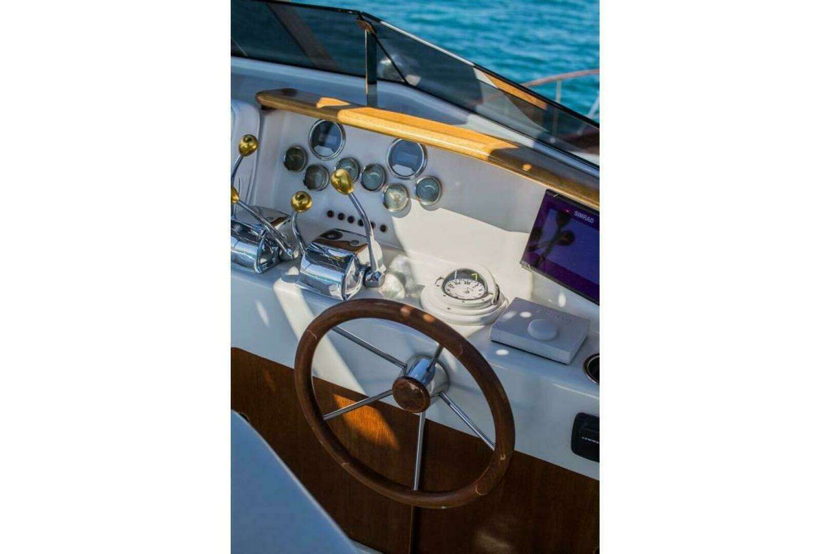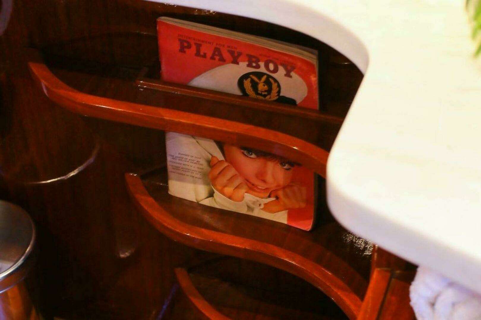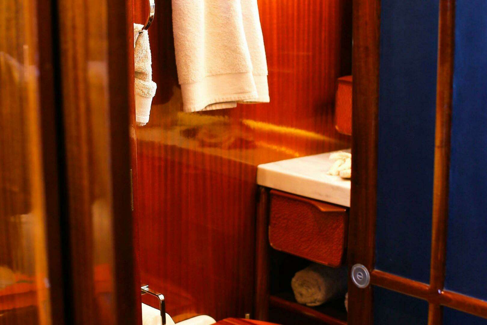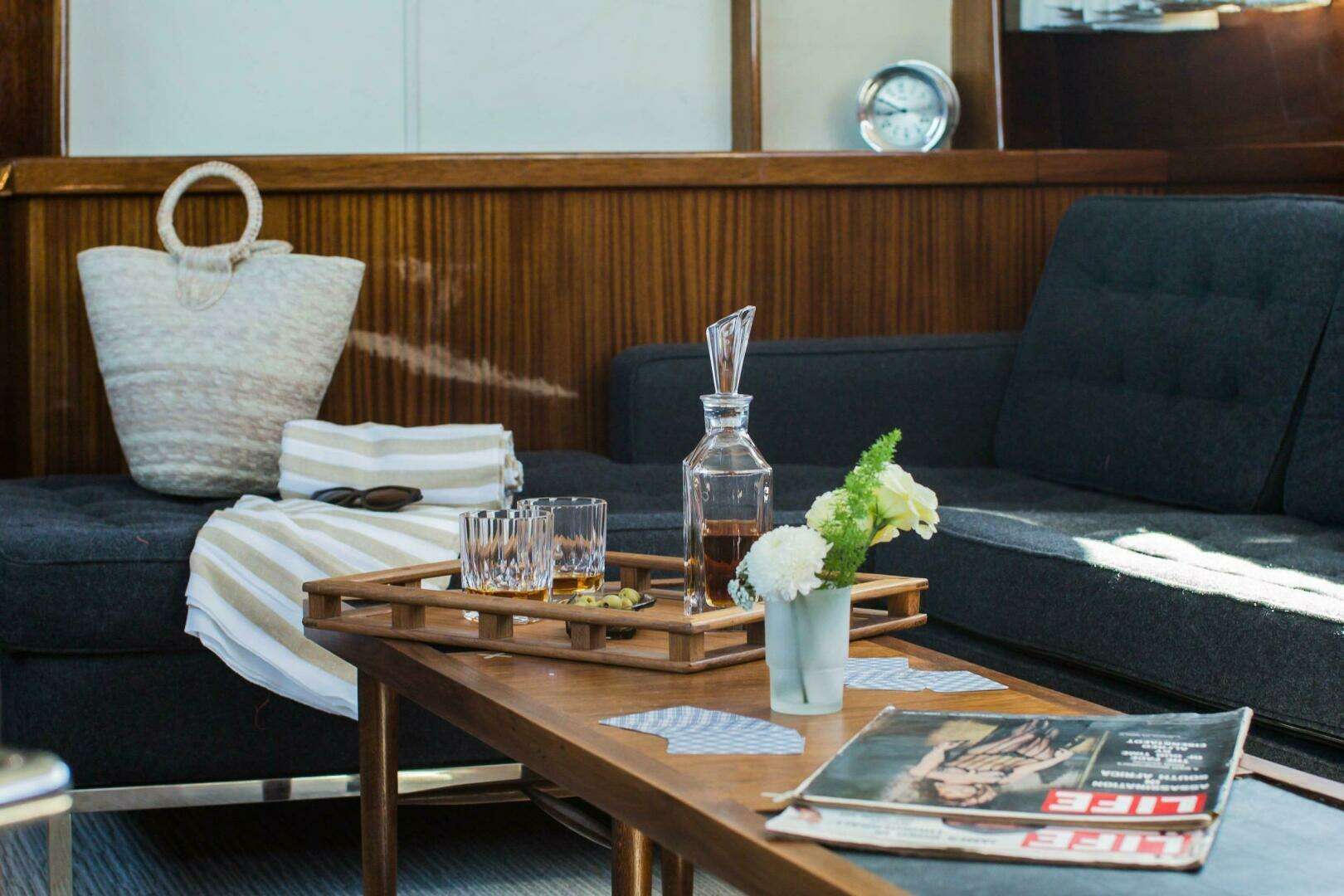 A fully remastered helm incorporates restored and vintage classical gauges and switchgear with a complete modern navionics suite. Semi-aniline leather hides line the console and frame an expansive 360 degree view around the yacht. A navy-upholstered Eames Executive Chair was adapted to serve as the captain’s perch.