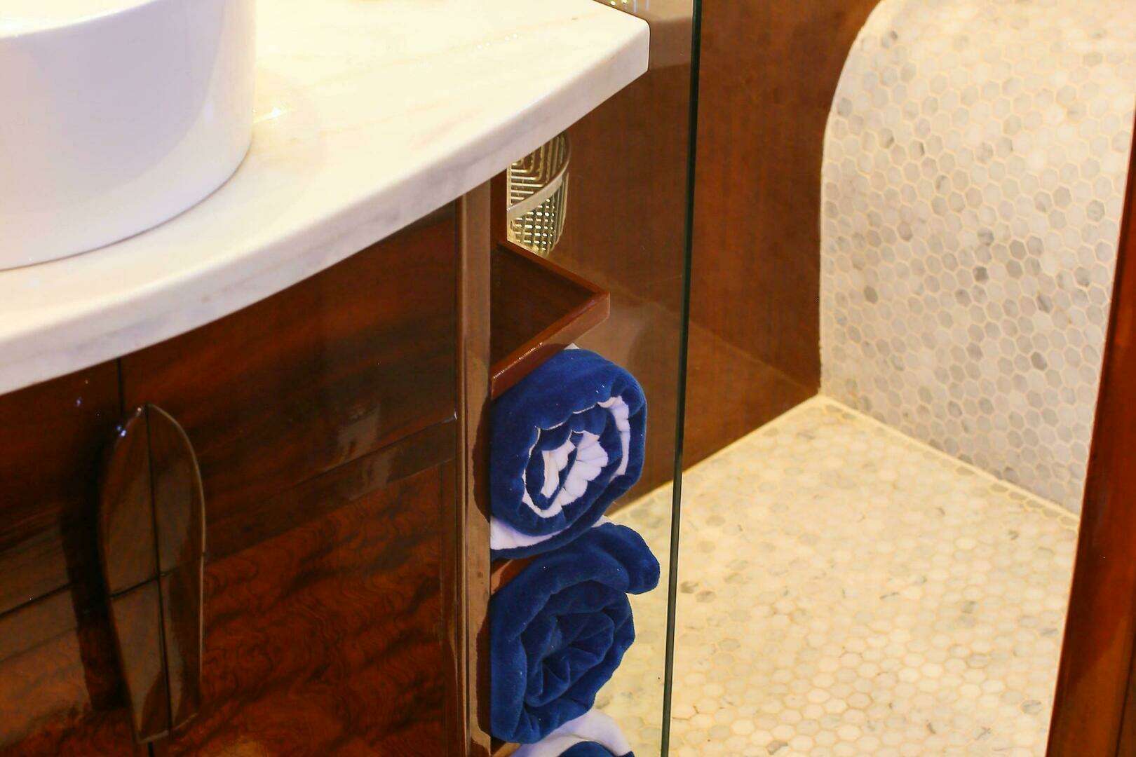 Curved shelves and solid marble countertops and hardwood drawers make each bathroom an extremely inviting place to be.