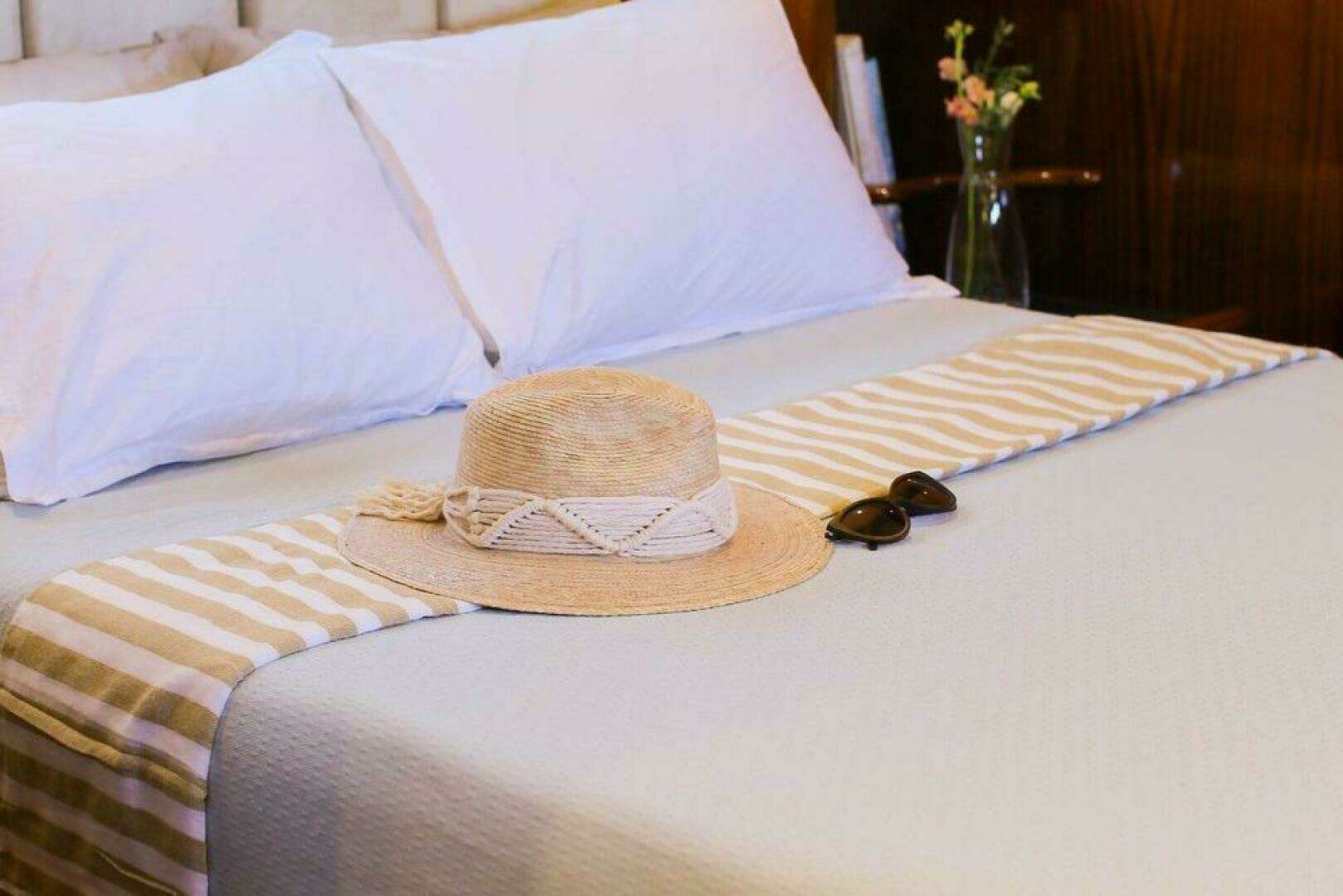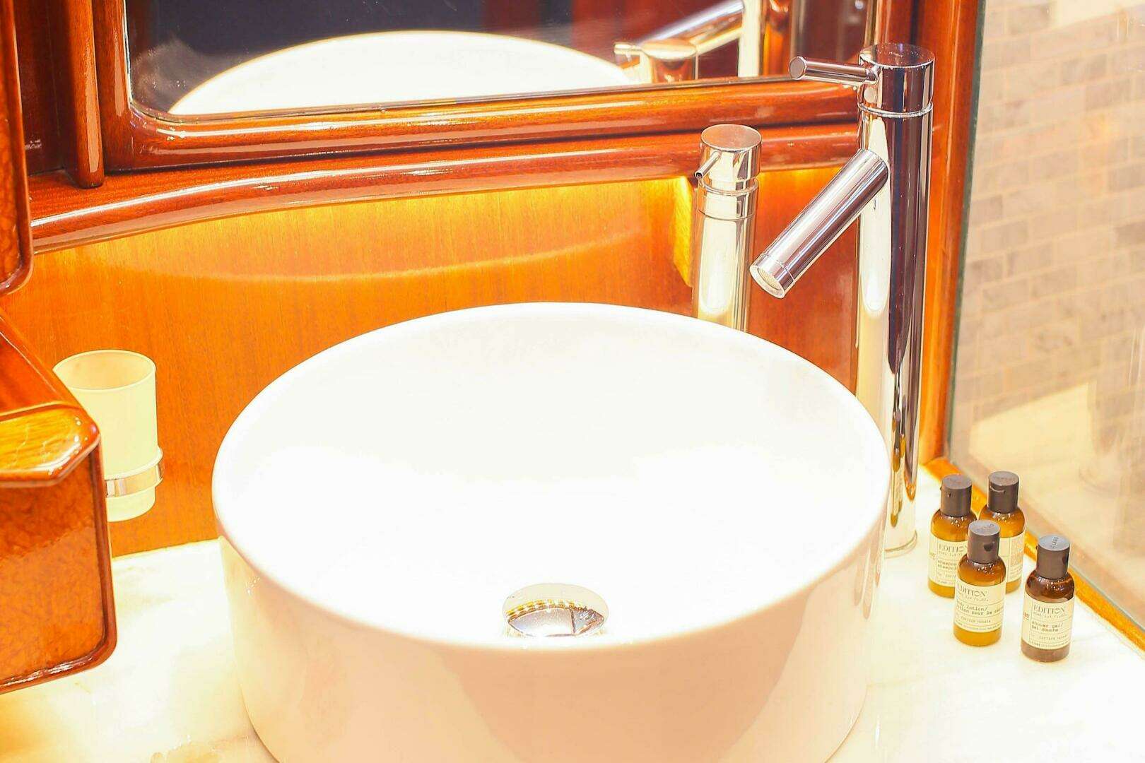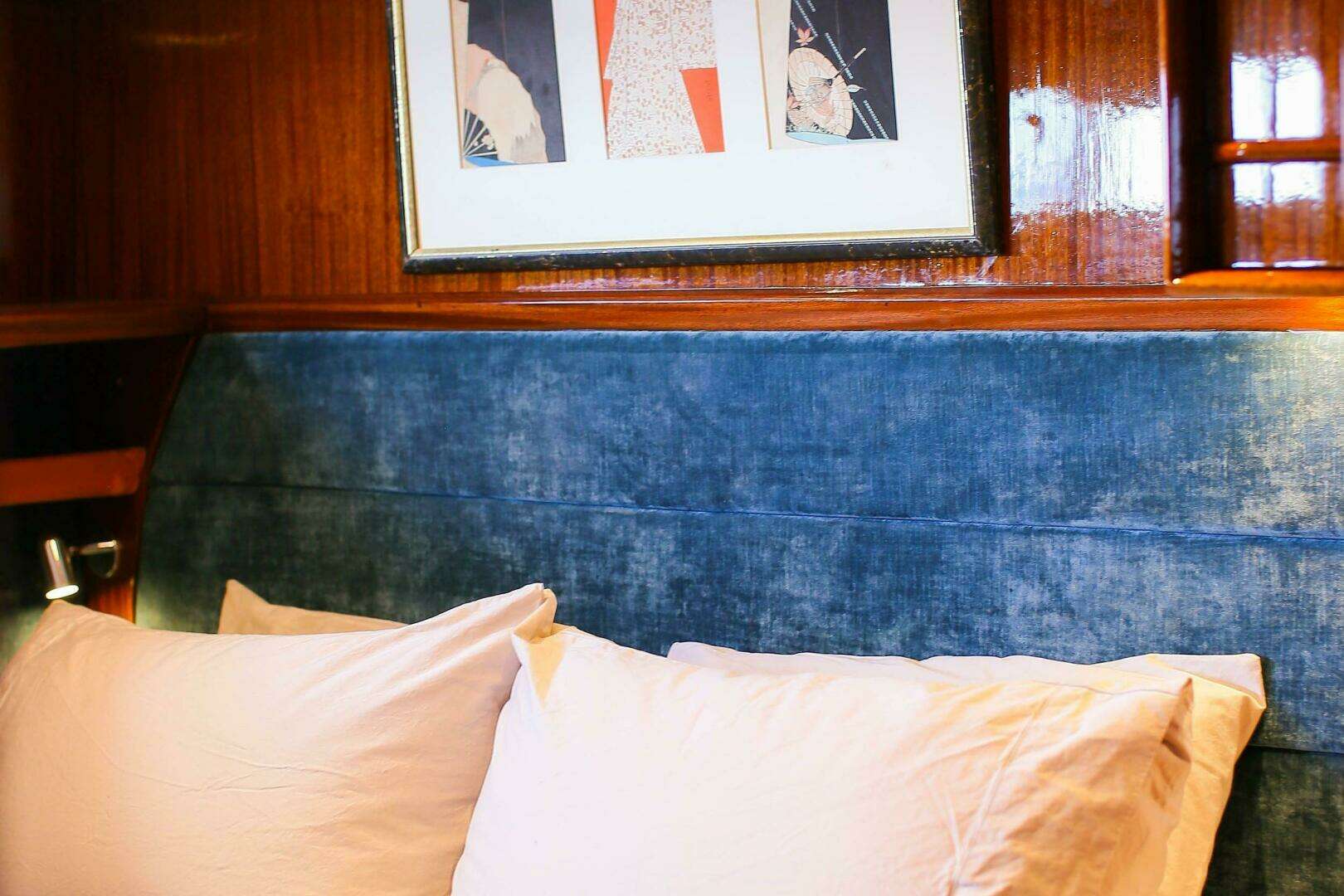 Vintage fabrics and custom sconces line the Guest Cabin while a jewelry box is hidden in the hardwood nighstand. Separate reading lights and charging outlets are included for each sleeping position.