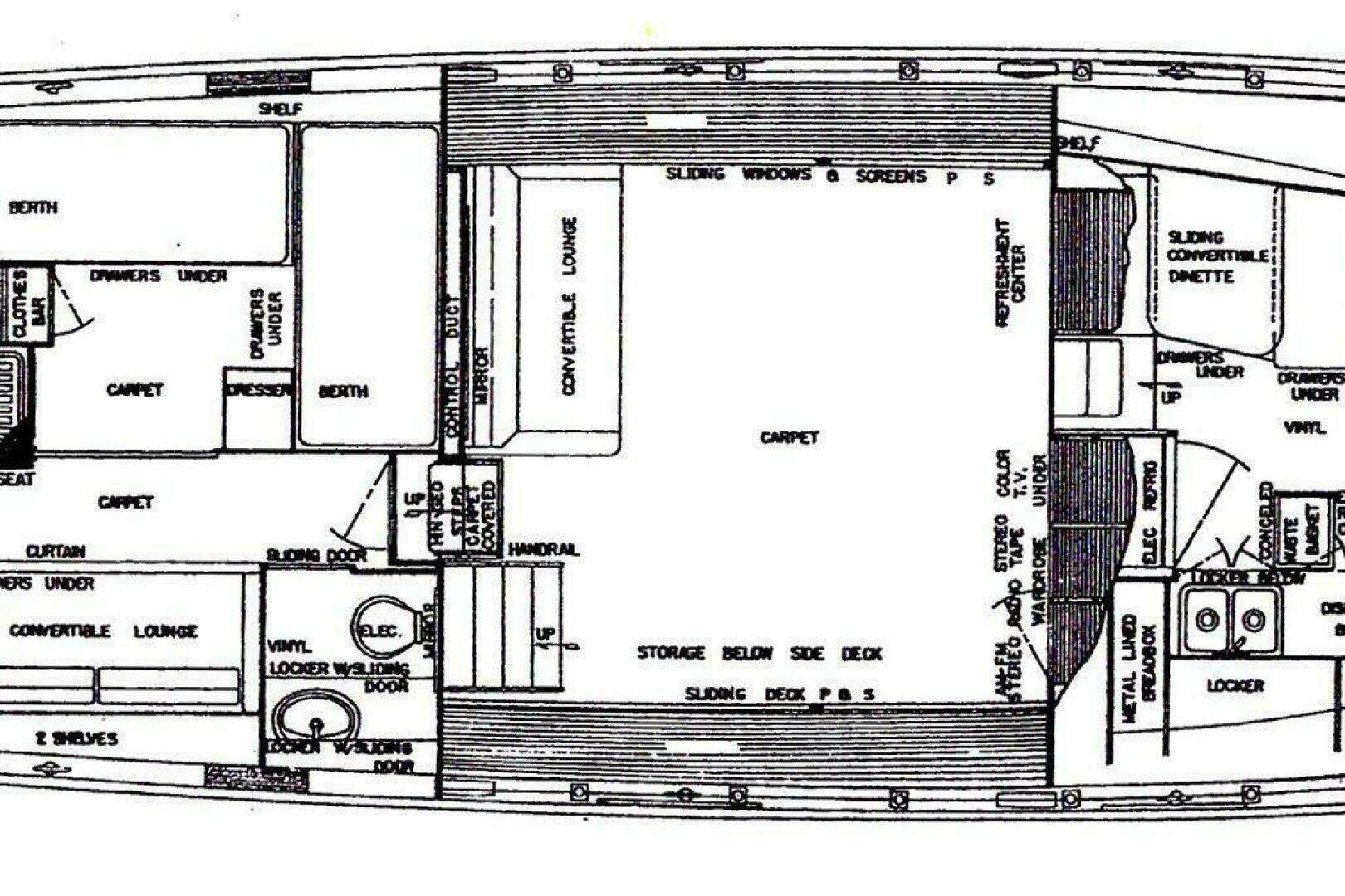 Each area of the interior was fully stripped, epoxy sealed or repainted, and ribs were sistered where necessary. Bulkheads were strengthened and tied together with longitudinal beams to add strength. Ceiling beams were tripled with hardwood and marine plywood to reduce floor bounce. Bulkheads between cabins and to the engine room were treated with an absorptive EPDM rubber sheet to reduce low frequency noise.