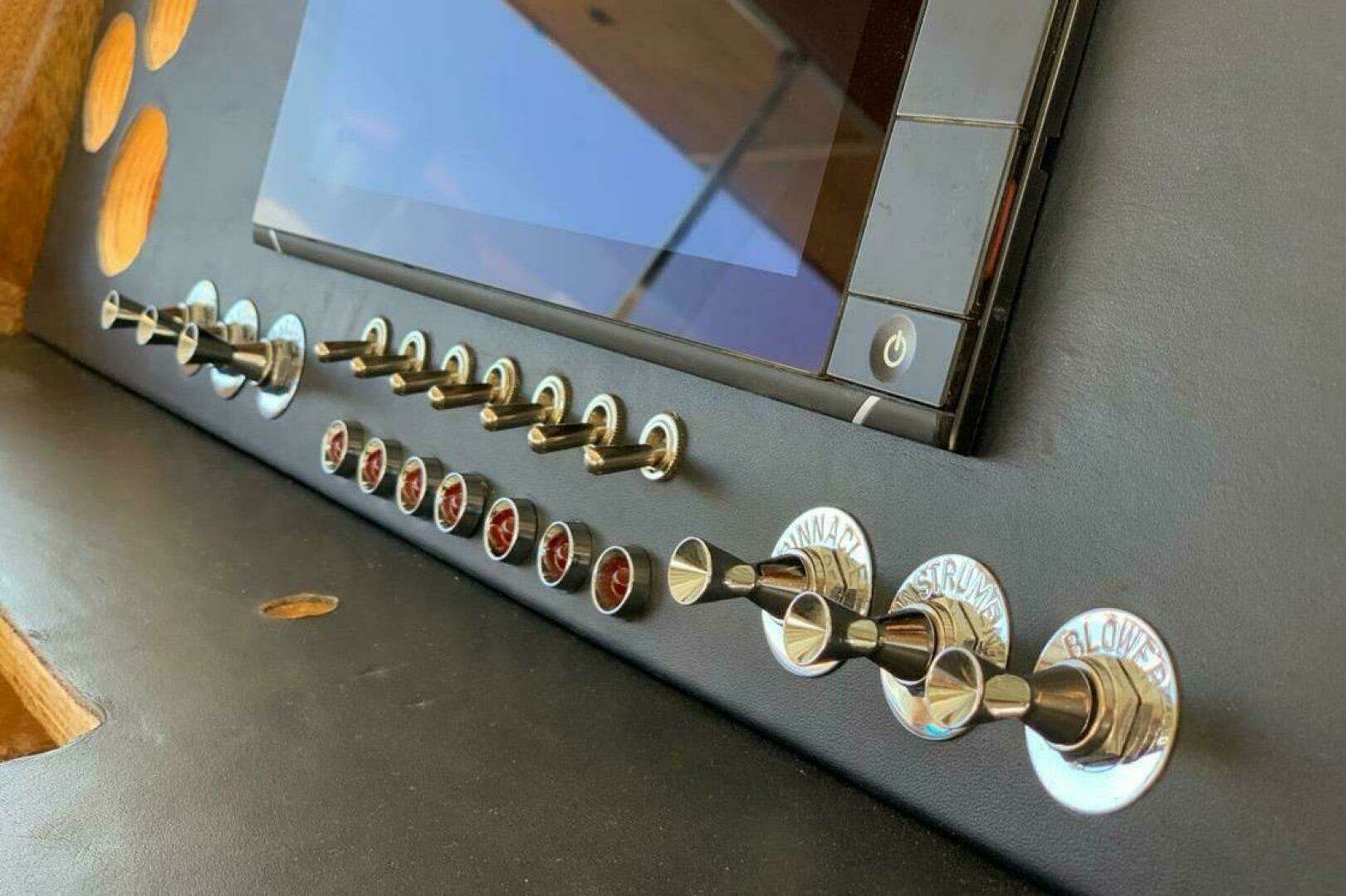 Full-grain navy leather contrasts with the bright chrome of vintage Chris Craft, Cole Hersee, and Perko switchgear and status lights.