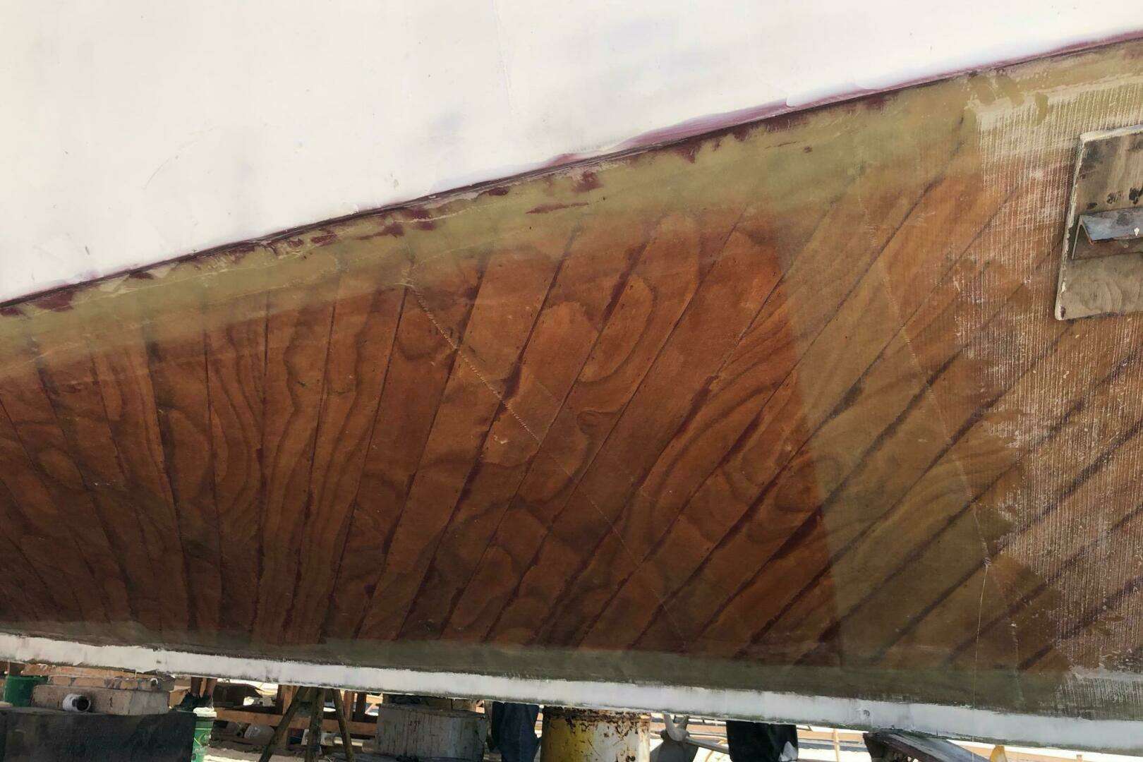 The new cold-molded planking is a combination of 2-4 layers of marine plywood sandwiched with thickened epoxy, each layer laid in diagonal orientation to the prior layer. After fairing, the cold molded hull is tied into the existing topside planking via 2-3 layers of epoxy.