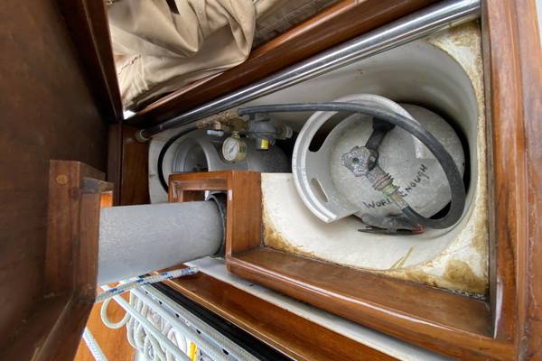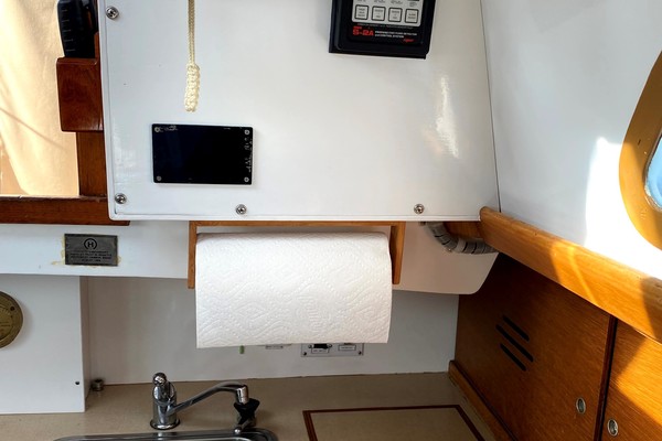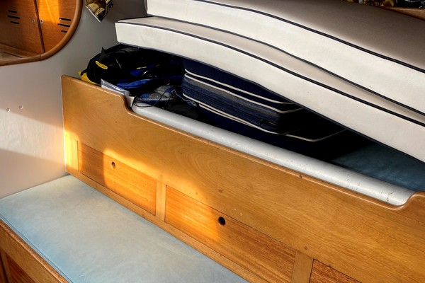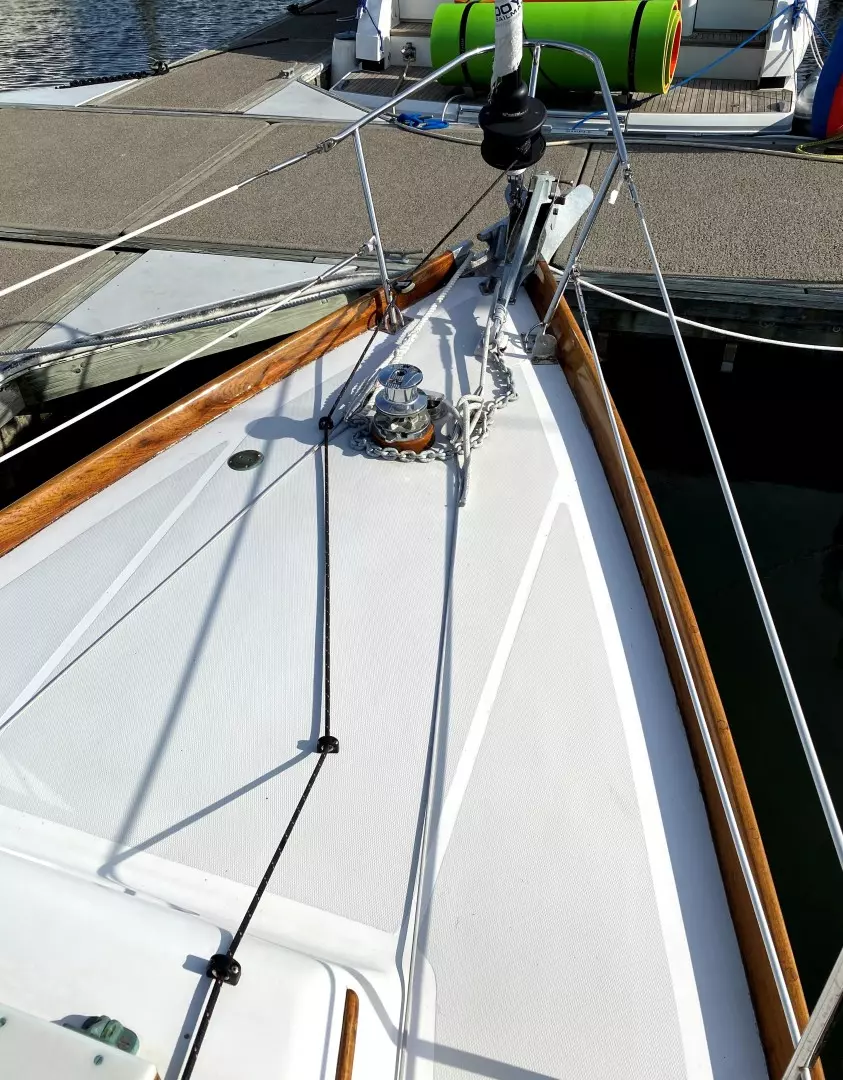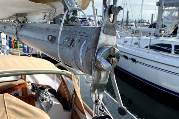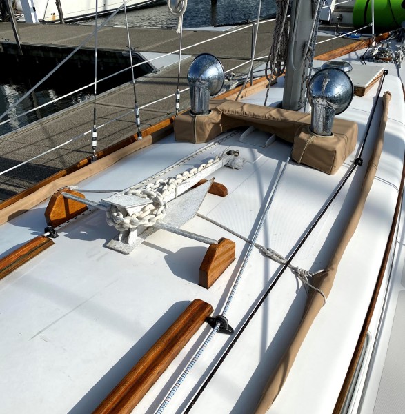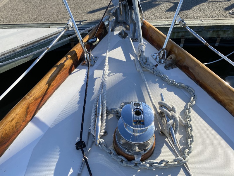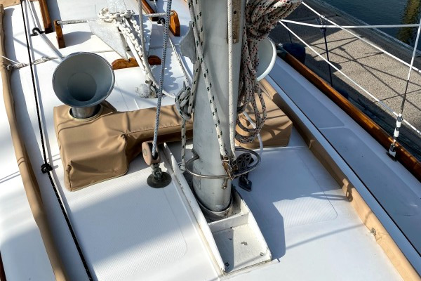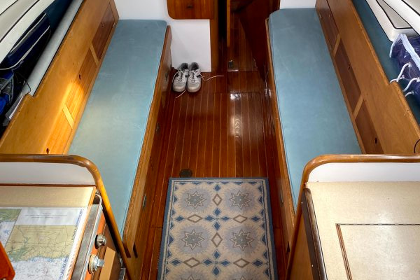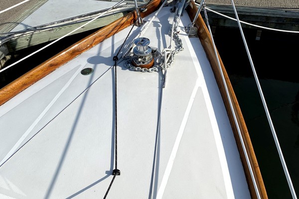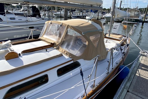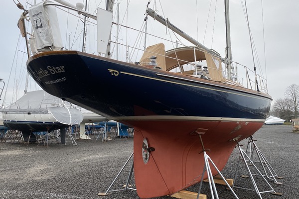 Designed by Sparkman & Stephens Hull #1211, LITTLE STAR was built in 1968 by The Hinckley Company in Southwest Harbor, Maine. The hull is hand-laid solid fiberglass that is no less than 3/8" thick throughout, with almost 1" thickness at the keel, with a fiberglass deck assembly. The deck is bedded onto a 6" hull flange and topped by the toerail bolted through both flange and deck. Varnished teak exterior trim consists of toerails, coaming, companionway, helm area and handrails.