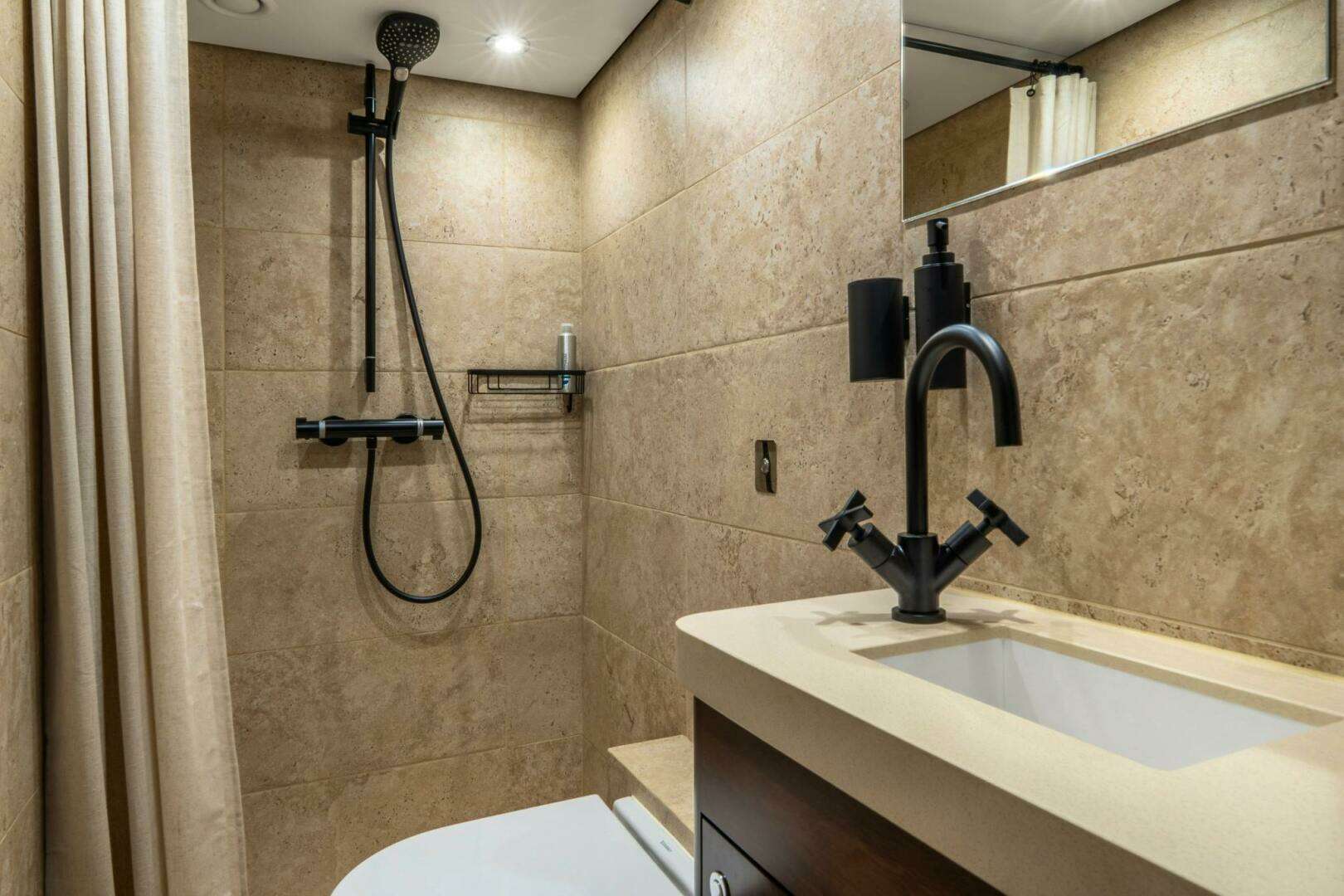 A “Gravity” based sewage system for the toilets allows for “silent” flushing. This system does not have any noise producing pumps or macerators in or under the cabins.