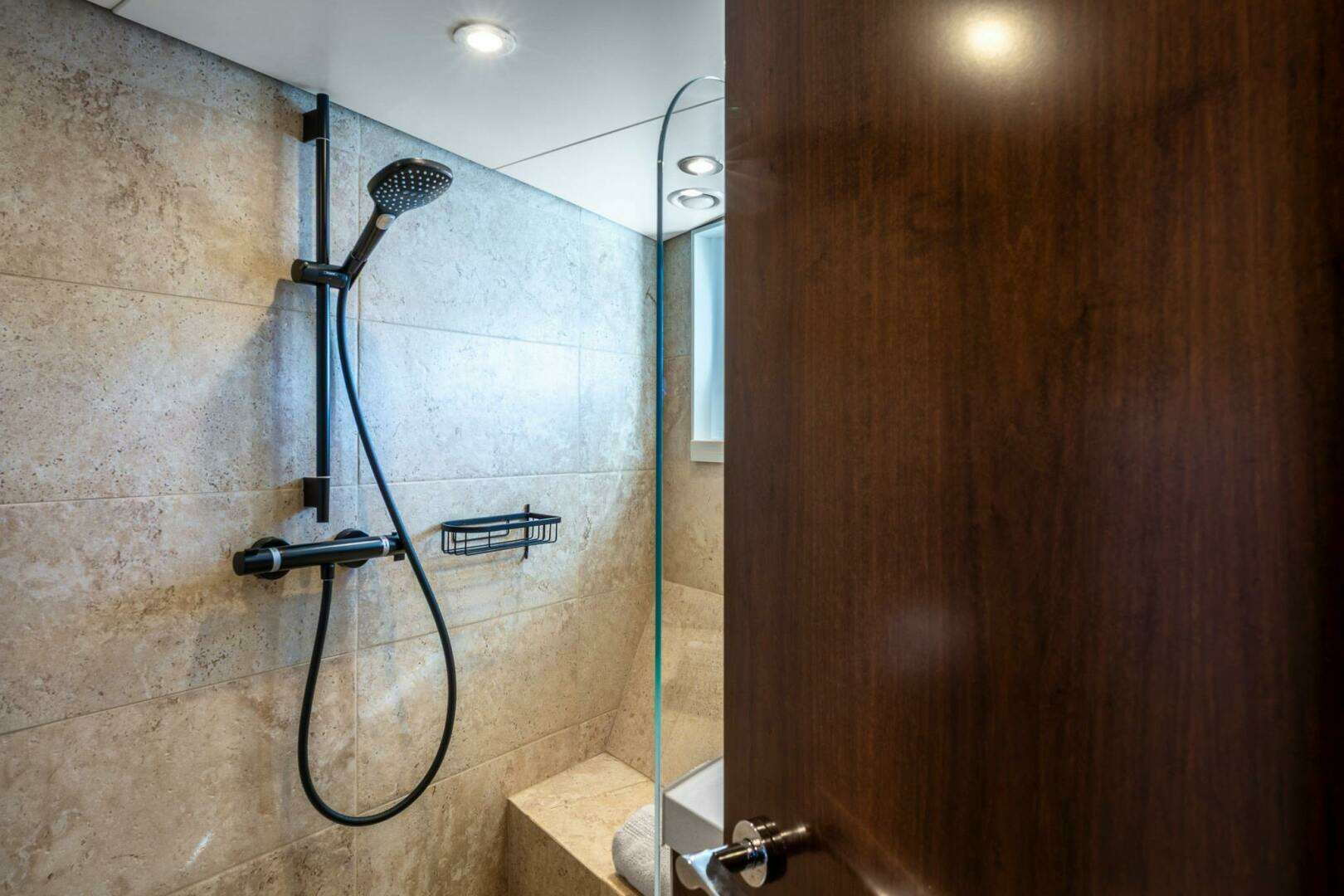 The master cabin is forward and has a queen size bed, a built-in walnut desk, settee, large drawers featuring a locker cabinet and 1 large walk-in wardrobe. 4 large hull windows flood the cabin with natural light and stunning sea views. The large owner’s bathroom was recently rebuilt with fresh stone and fittings. The ensuite offers a large 2-person bath and a large hull window with sea views. There is a separate “rain” shower and toilet.