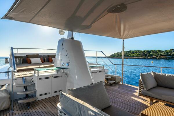 The upper deck has a large aft sun bed featuring an integrated table that can be raised to transform into a dining / lounge seating. The center of the upper deck has lounge sofas with coffee table.Forward, above the wheelhouse is a further 8-person sun bed with seating. The chimney houses 1 fridges and a wet point with hot/cold water. The tab acts also as a shower.