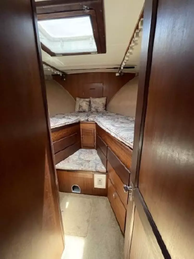 Starting forward; Private cabin with V-berth or single port and starboard berths, seat in between, small vanity with sink to port and large hatch above. There is plenty of storage with drawers under the berths and a hanging locker aft to starboard.