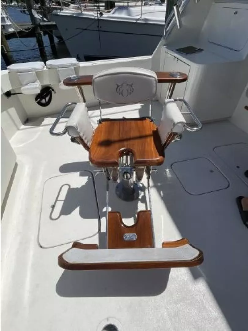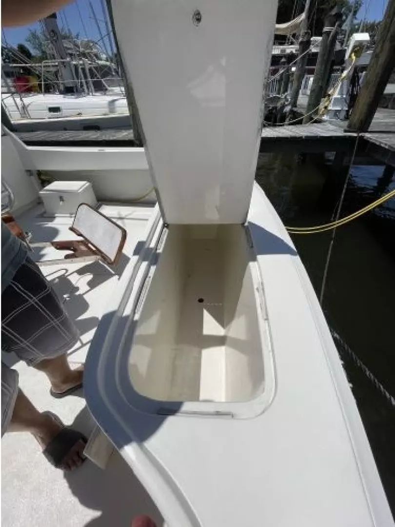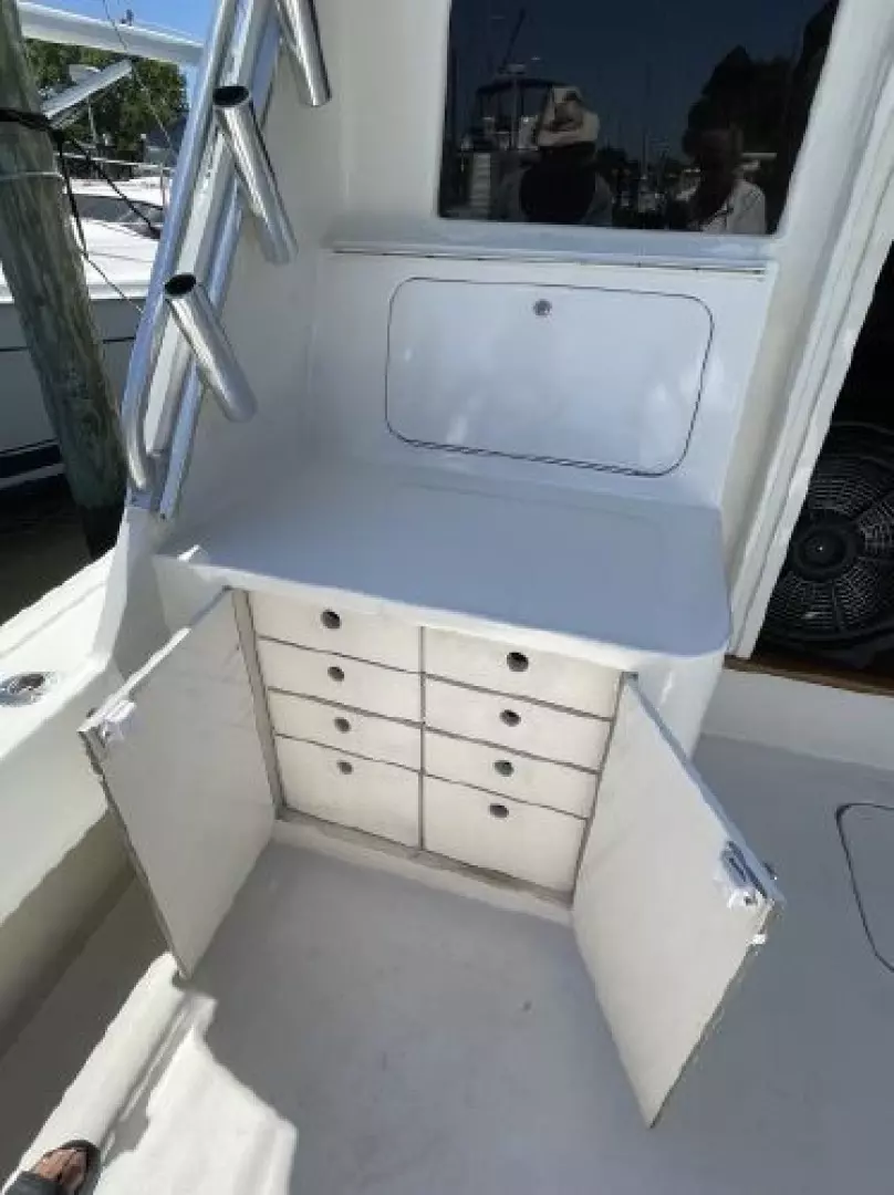 A centerline door leads to her large cockpit. Here one will find there have been some modification to the original design. A large bait well was added and molded into her transom, also allowing to double as a bait cutting table that can be placed on top. Center is the Fighting chair where the magic happens. There is a large live well under the cockpit sole. A huge custom built and molded in storage locker or fish hold with drain to starboard on the aft bulkhead. To port is a custom and molded in tackle compartment with multiple drawers for all your fishing needs. Both lockers have custom cushions and seat back for additional cockpit seating.