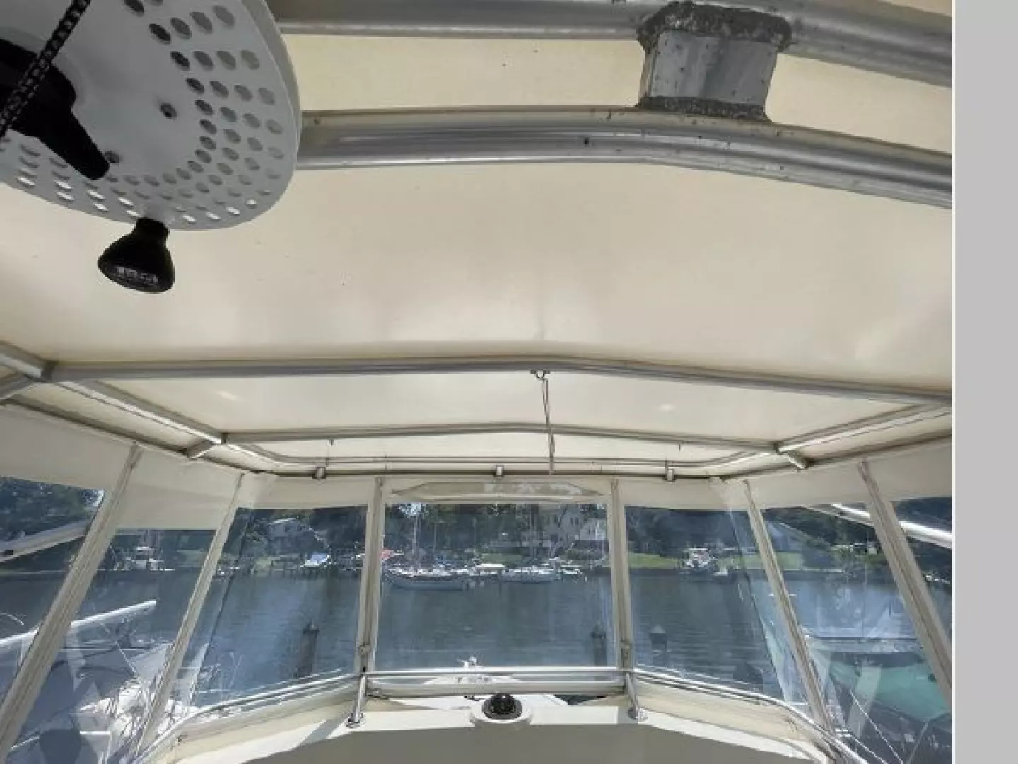 A substantial and custom pipe welded frame, ladder and six rod holders were installed on the flybridge in 2003. Her top has recently been replaced and she has a full enclosure for inclement weather conditions. There are two helm seats and forward of the helm is a forward facing bench seat with cushions.