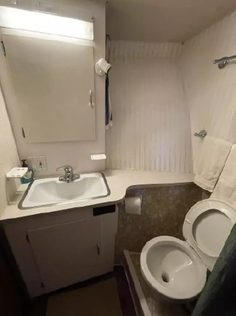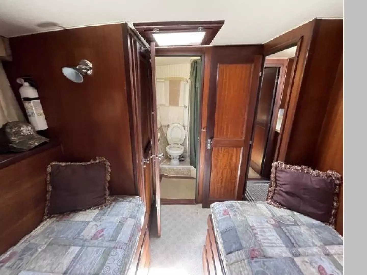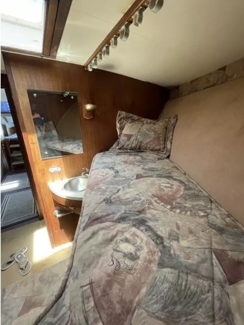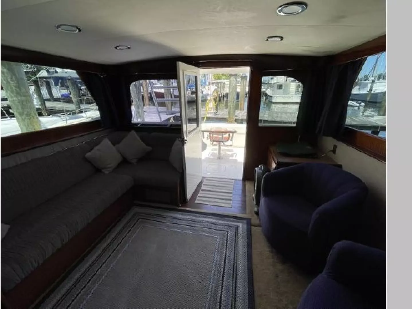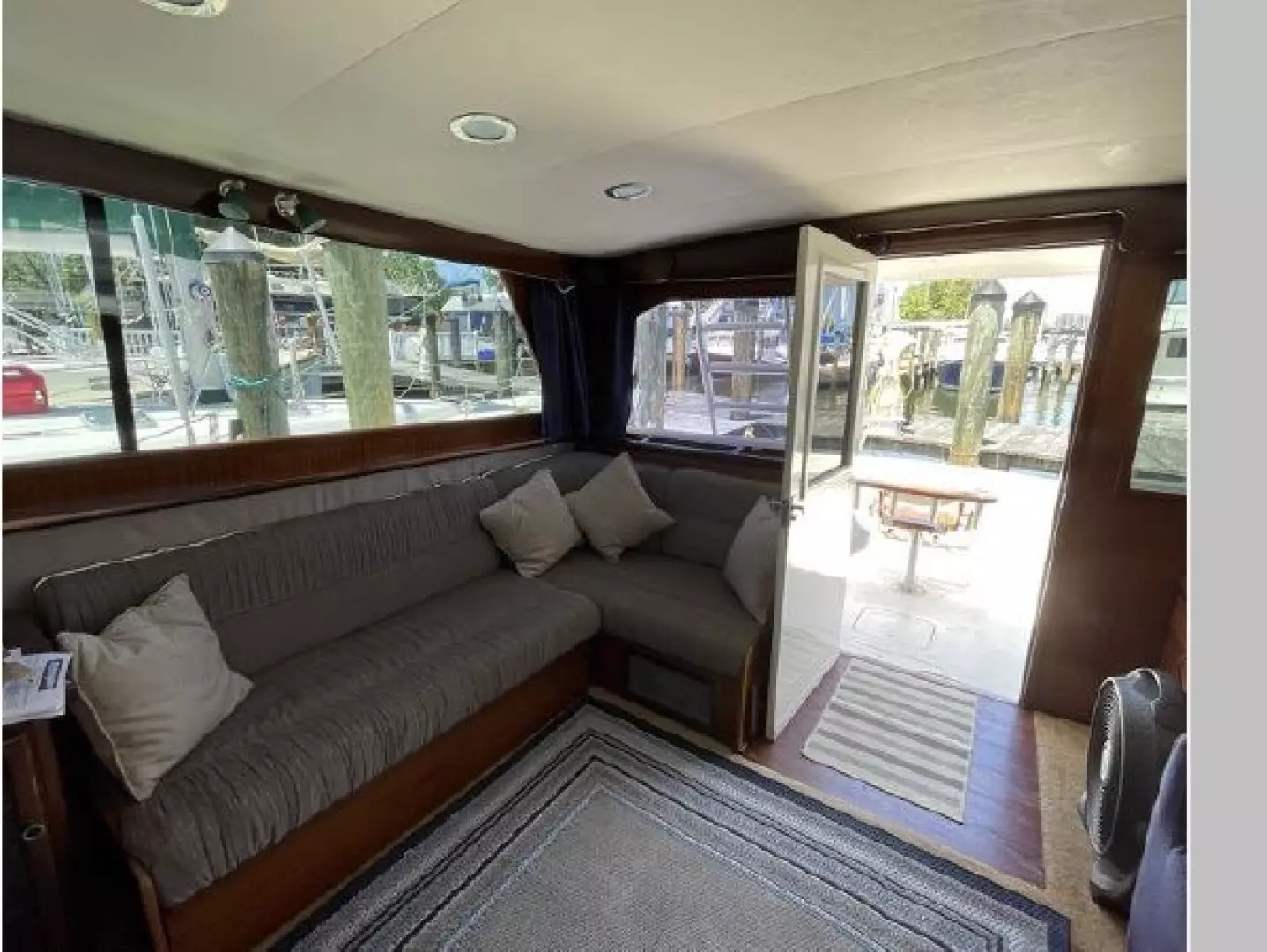 Her interior is warm with Tiger Mahogany throughout yet the salon is bright with her large windows. Carpet on her sole in the salon and navy curtains all around. Access to her engine compartment is via the sole in the salon.