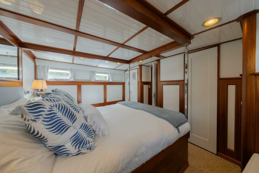 SOMERSET features the typical Trumpy Flush Deck layout with crew accommodations forward, followed by a galley to port and dinette to starboard. Her saloon is next aft, finished in beautifully warm and well-patinated butternut with a sofa to starboard, a centerline love seat, and an easy chair to port, providing comfortable seating for six. Twin companionways aft provide access, both down to the two guest cabins and up to the wheelhouse, as well as to the expansive 120-square-foot enclosed aft deck. SOMERSET will comfortably accommodate 4 in the owner’s party and 2 in crew.