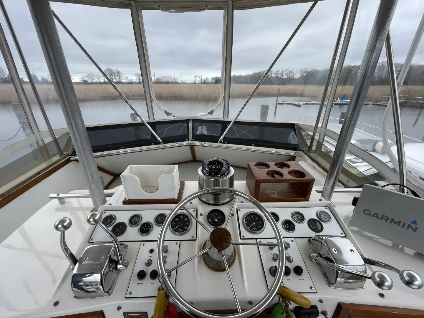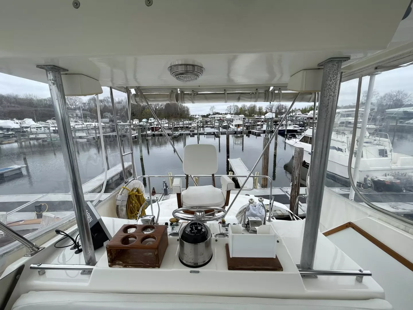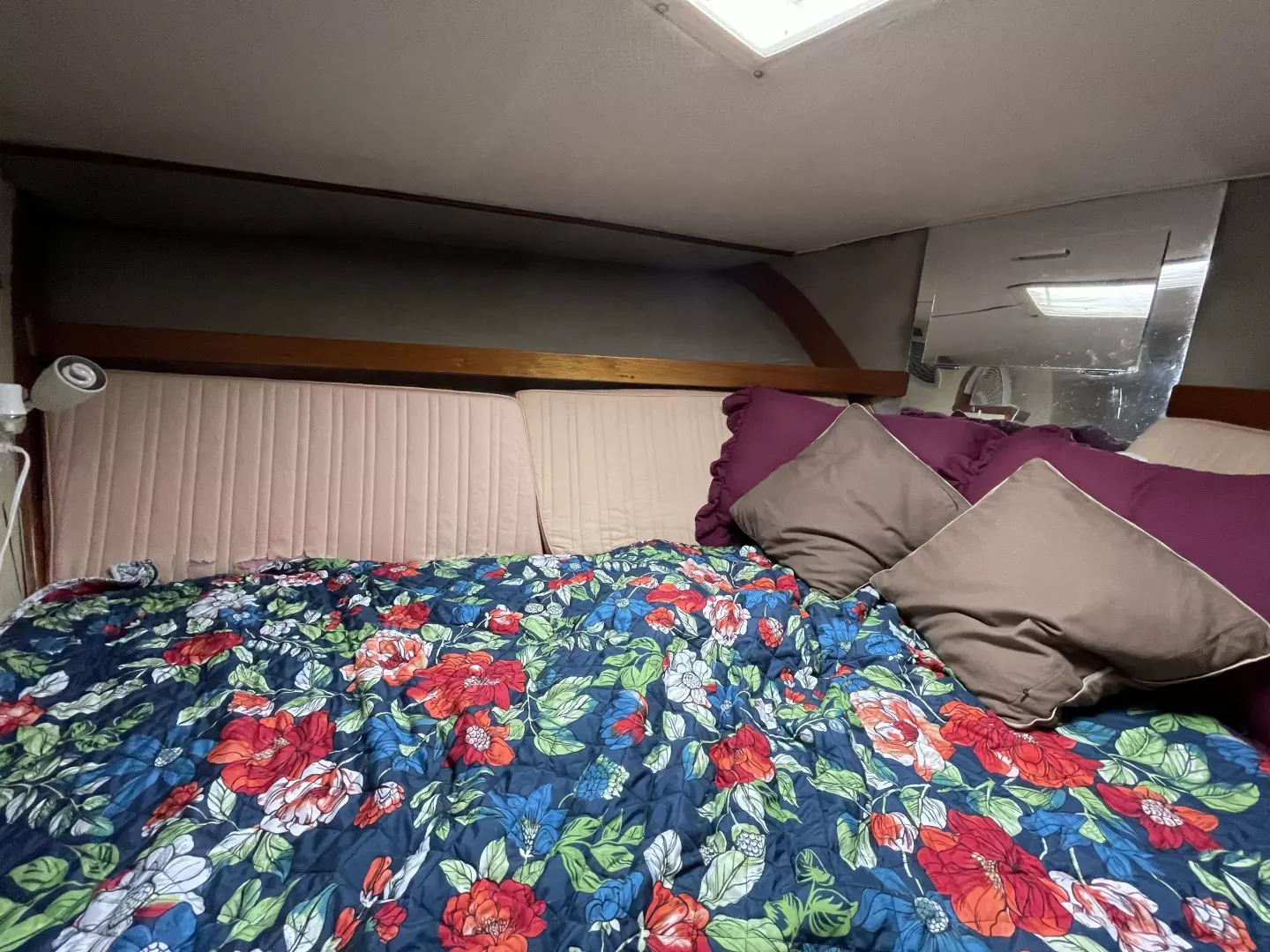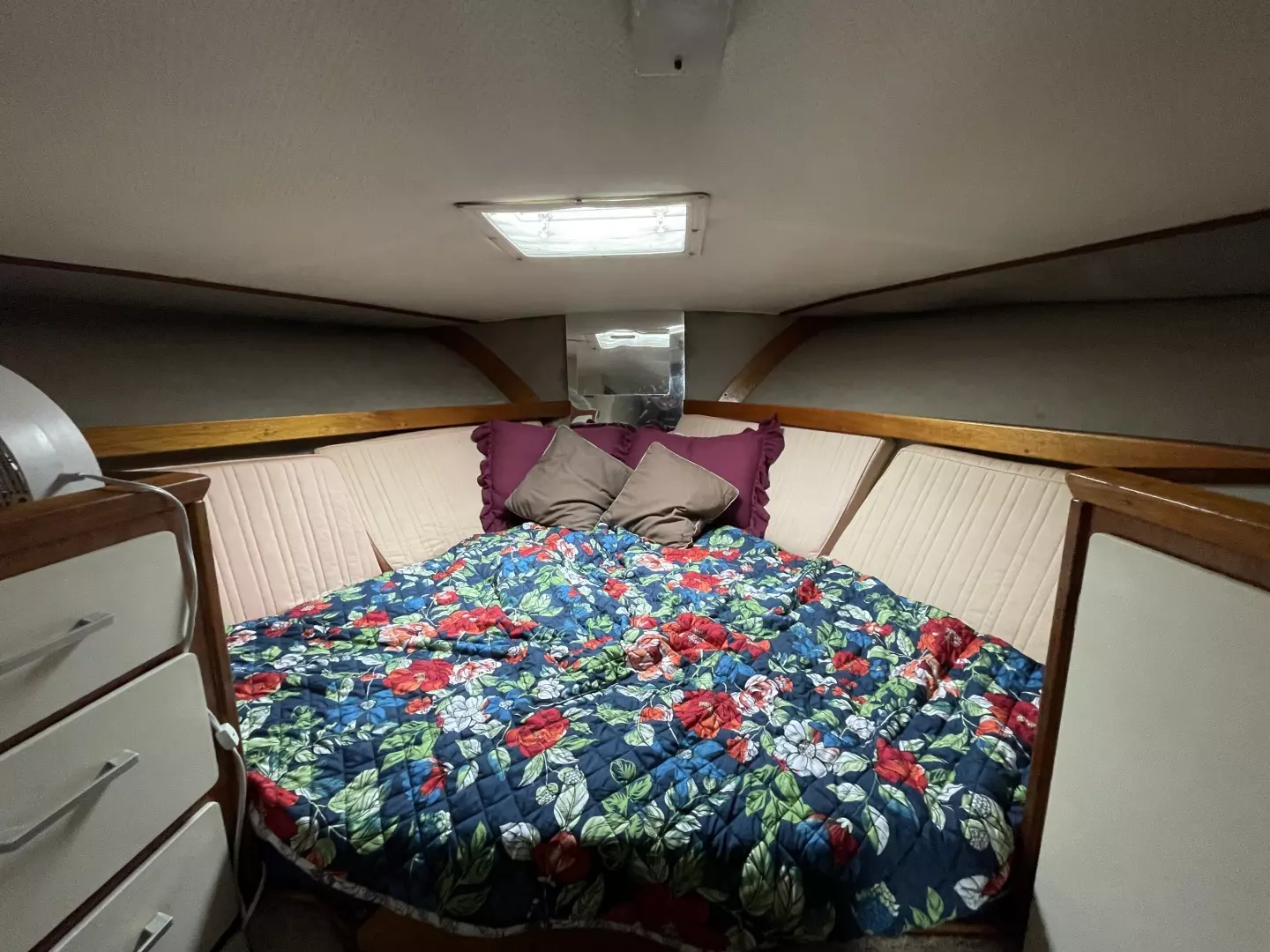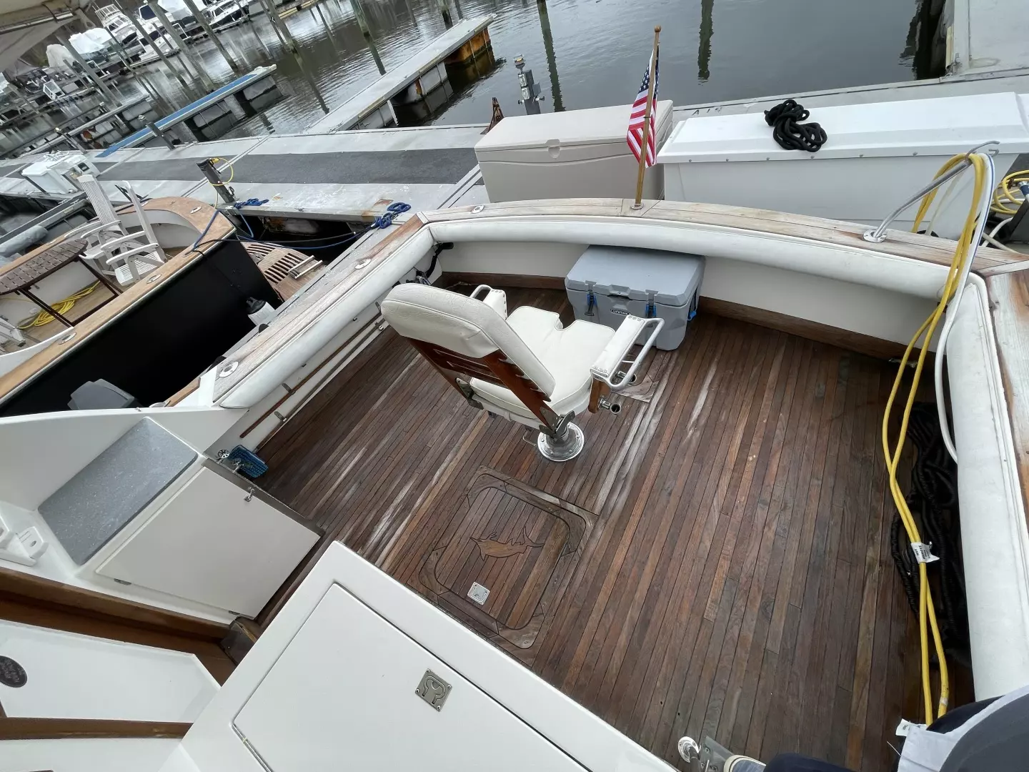 Master stateroom is forward with a full Queen bed, cedar lined closet, ventilation hatch and dresser. Aft to port is the second stateroom with upper and lower berths with hanging locker and drawer storage. Aft to starboard is the head with separate stall shower. Up a couple of steps to the salon area with a settee to port and the spacious galley to starboard. Out the salon door to a large cockpit with a teak deck suitable for fishing or entertaining. Up on the flybridge you have a center helm with full instrumentation and a forward-facing bench seat.