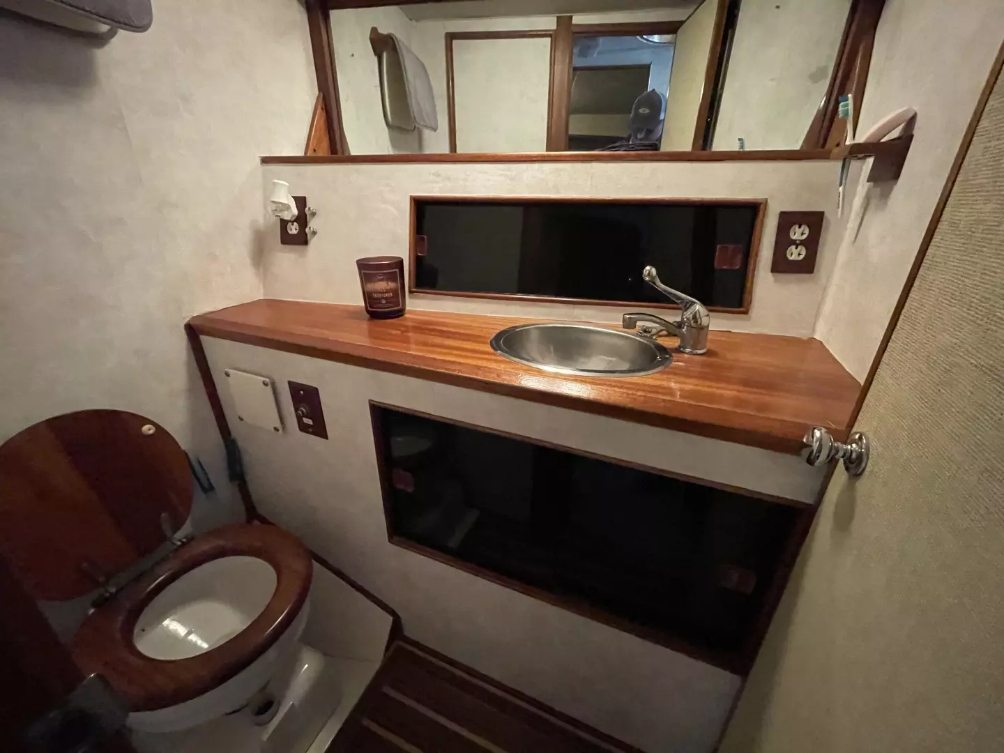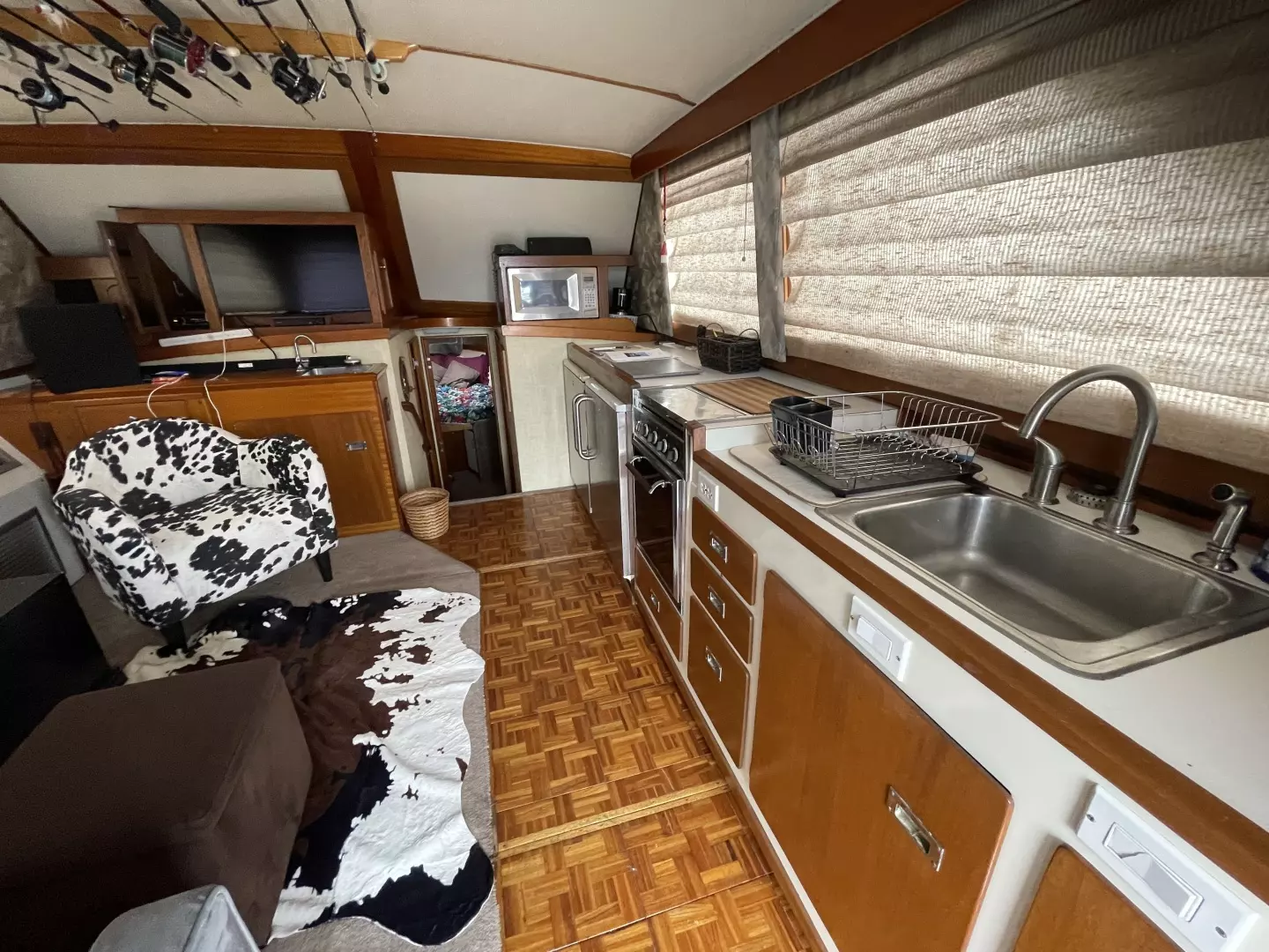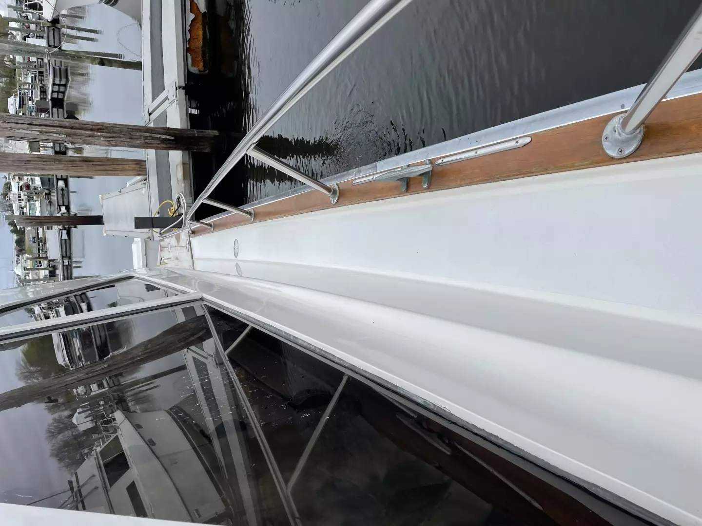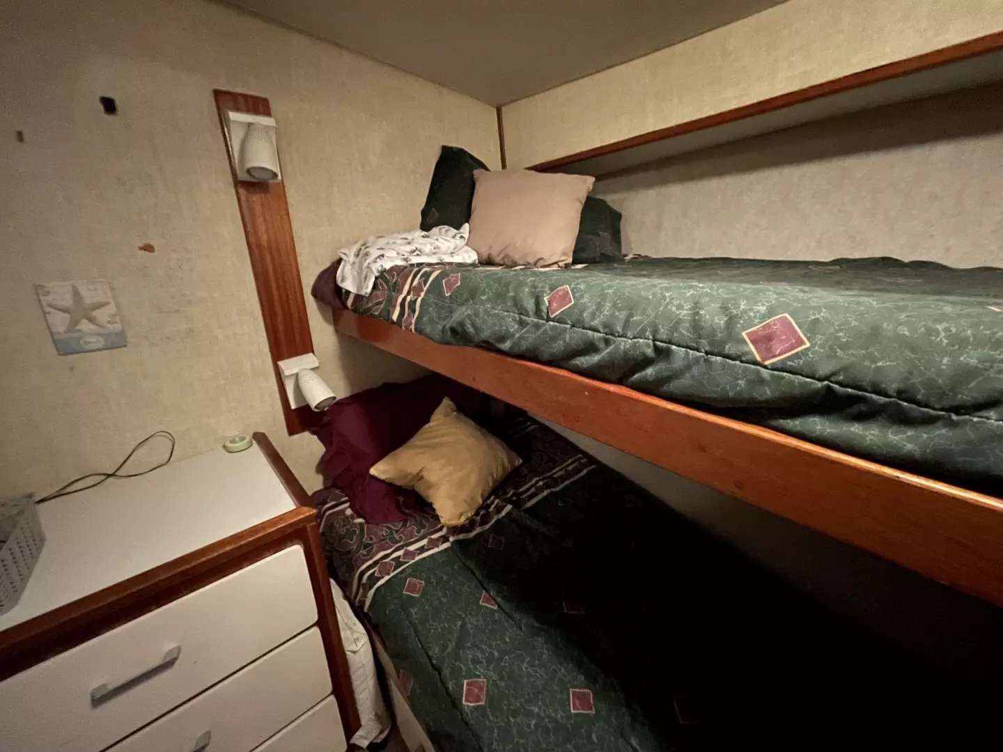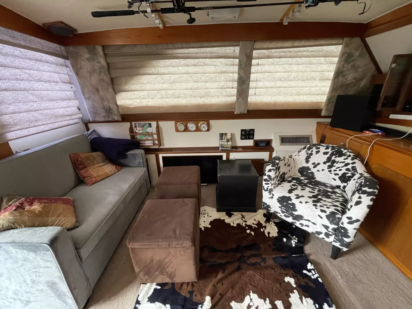 Master stateroom is forward with a full Queen bed, cedar lined closet, ventilation hatch and dresser. Aft to port is the second stateroom with upper and lower berths with hanging locker and drawer storage. Aft to starboard is the head with separate stall shower. Up a couple of steps to the salon area with a settee to port and the spacious galley to starboard. Out the salon door to a large cockpit with a teak deck suitable for fishing or entertaining. Up on the flybridge you have a center helm with full instrumentation and a forward-facing bench seat.