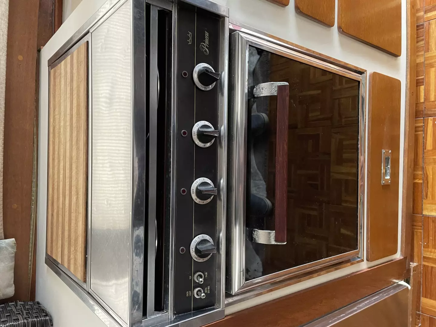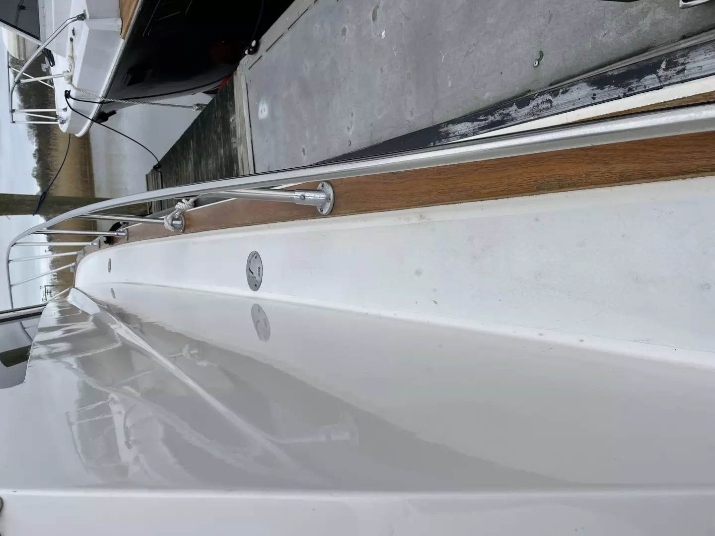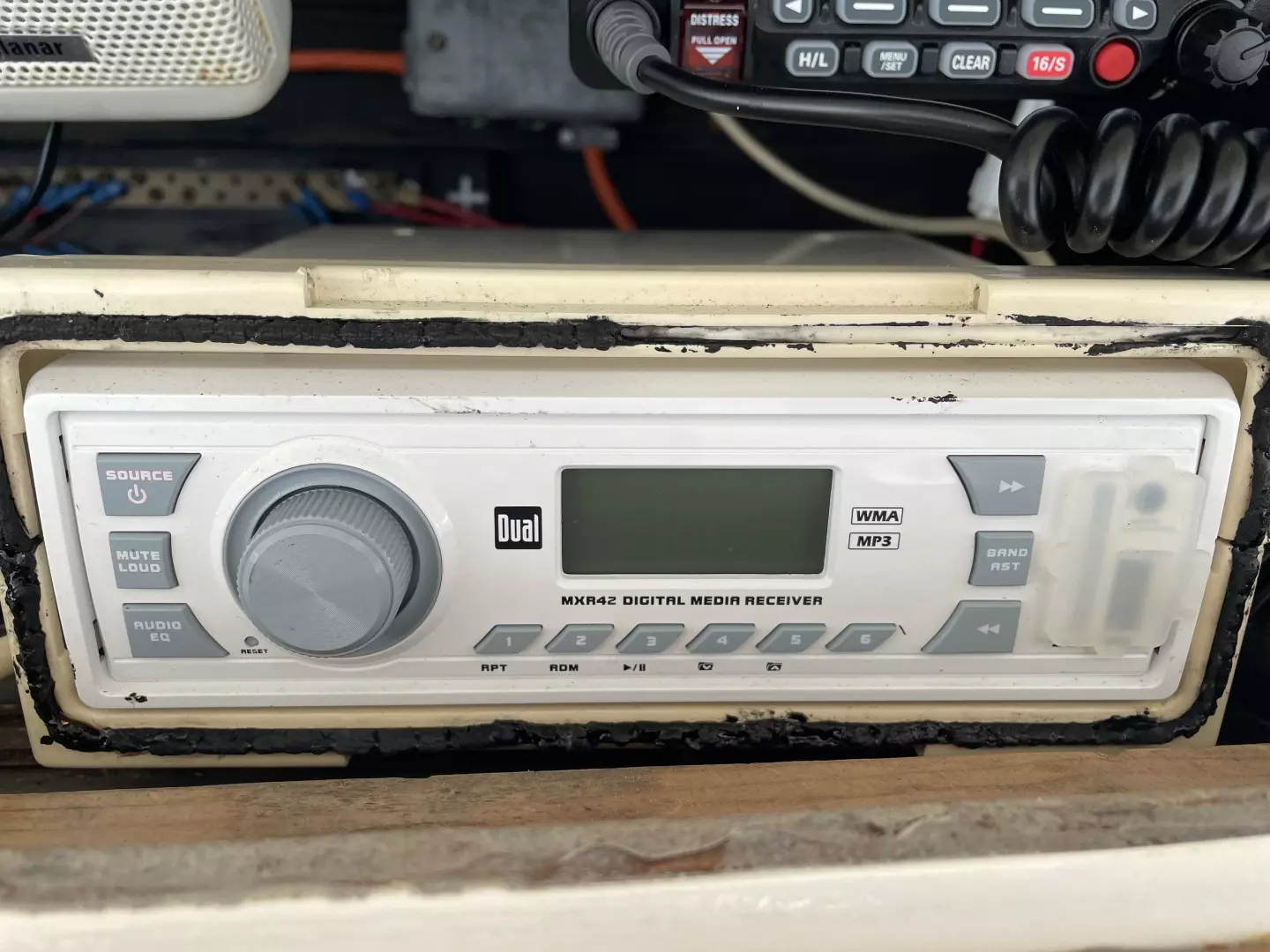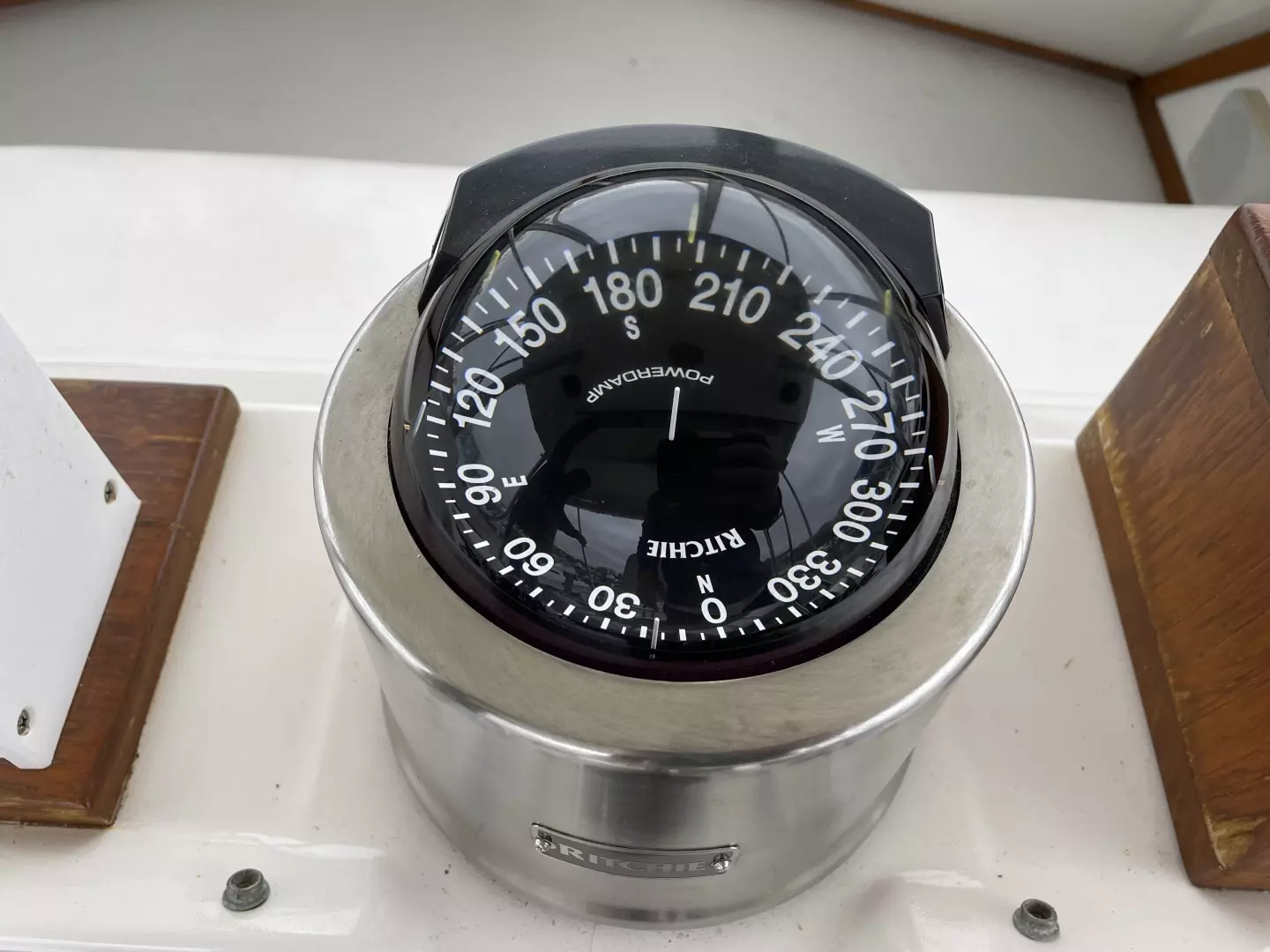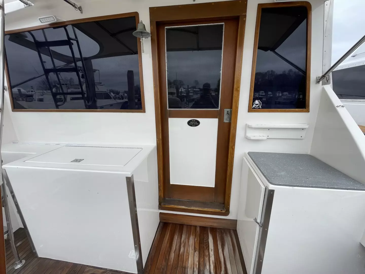 Master stateroom is forward with a full Queen bed, cedar lined closet, ventilation hatch and dresser. Aft to port is the second stateroom with upper and lower berths with hanging locker and drawer storage. Aft to starboard is the head with separate stall shower. Up a couple of steps to the salon area with a settee to port and the spacious galley to starboard. Out the salon door to a large cockpit with a teak deck suitable for fishing or entertaining. Up on the flybridge you have a center helm with full instrumentation and a forward-facing bench seat.