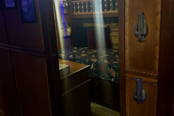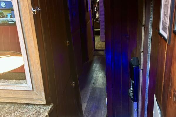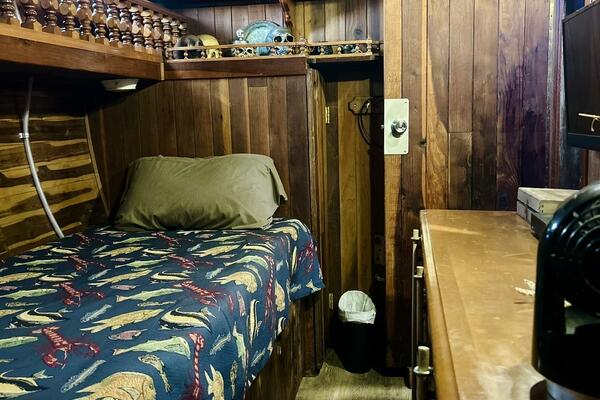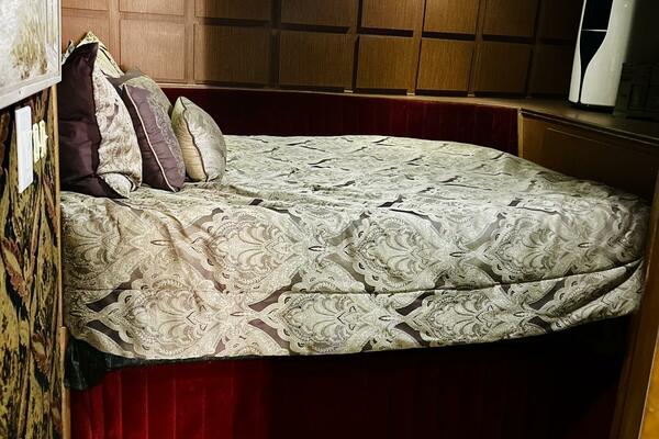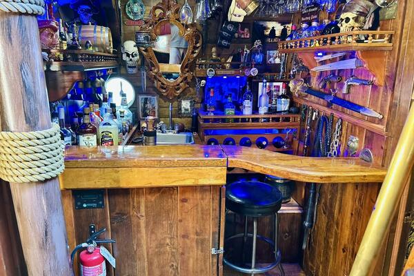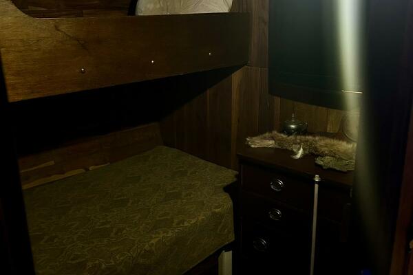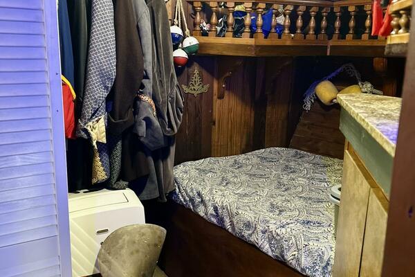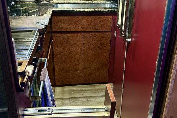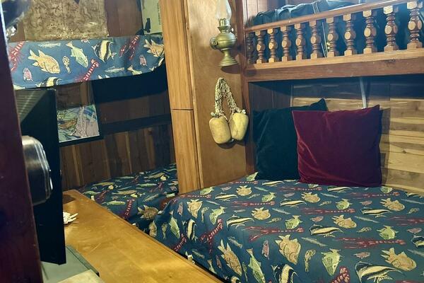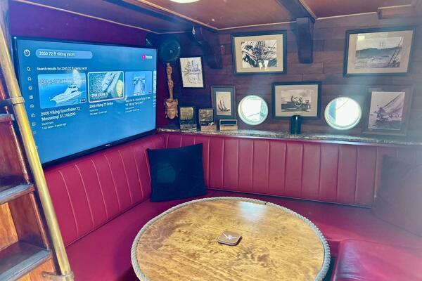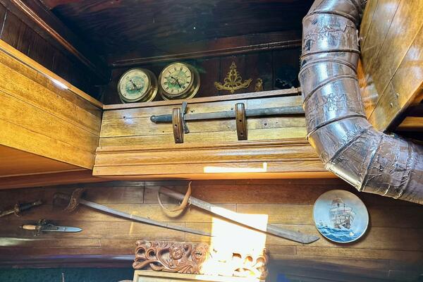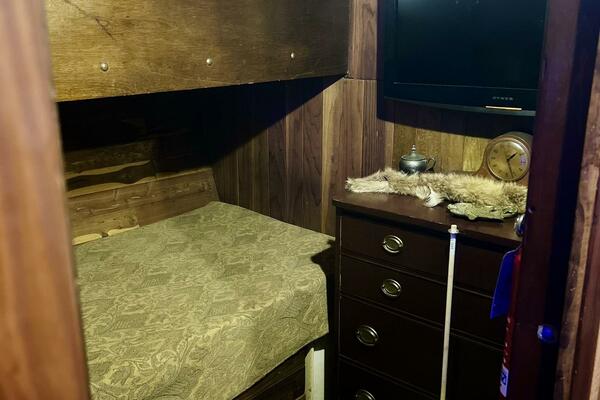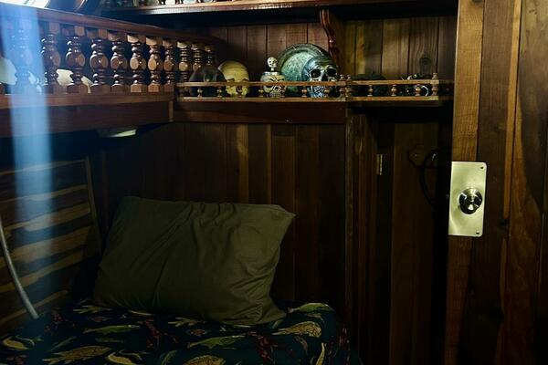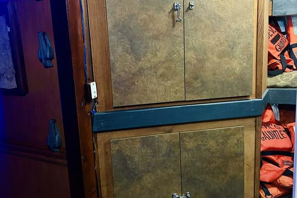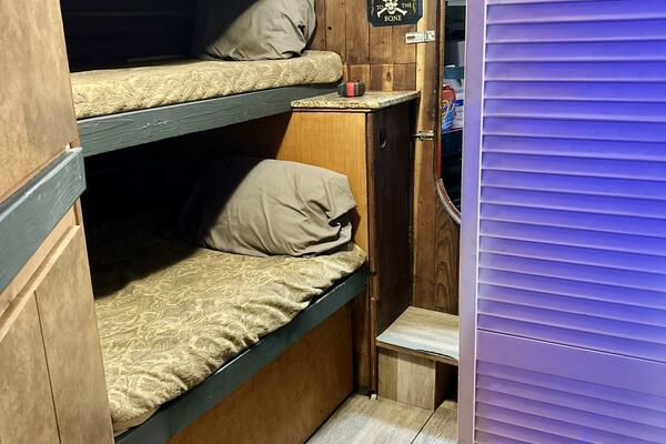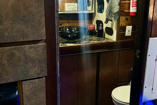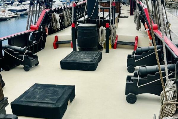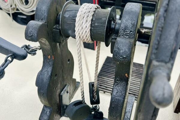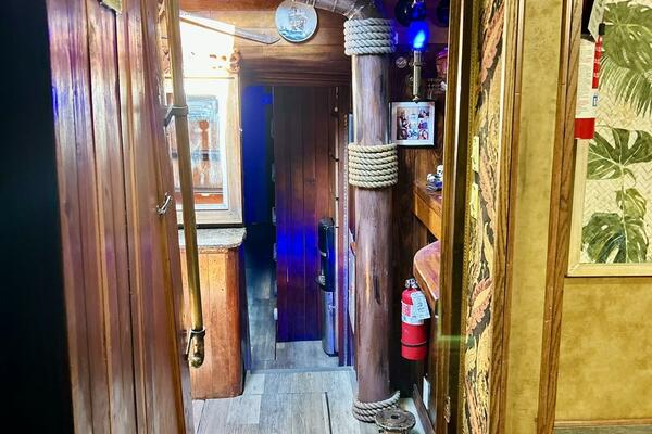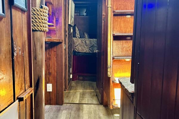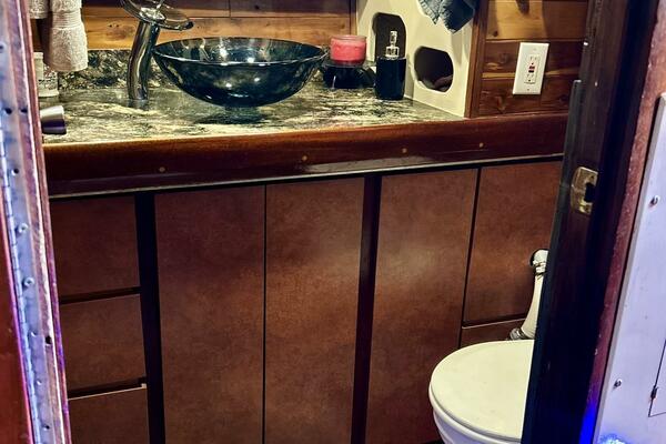 The Devil's Gauntlet boasts 2 wooden masts, a bow pulpit, with the wheel and upper rudder post aft of the raised companionway. She has a forward sloping aft deck with a boom gallows just aft of the wheel station. A seven rung wooden ladder that leads down the companion way into the main salon which has a full wet bar with a sink and serving counter. There is a U-shaped settee with a granite counter top end table and mirrored cabinet above. Her centered passage leads forward down two steps where on the starboard side is the main AC panel box, the guest head, and the aft and forward guest state rooms. On the port side is access to the fuel filters, the U-shaped galley, and the aft and forward guest state rooms. A wooden swing door leads from the port forward state room to the V cabin, which is currently used as a tool and spare equipment room. Aft is the master state room with its own on suite head.