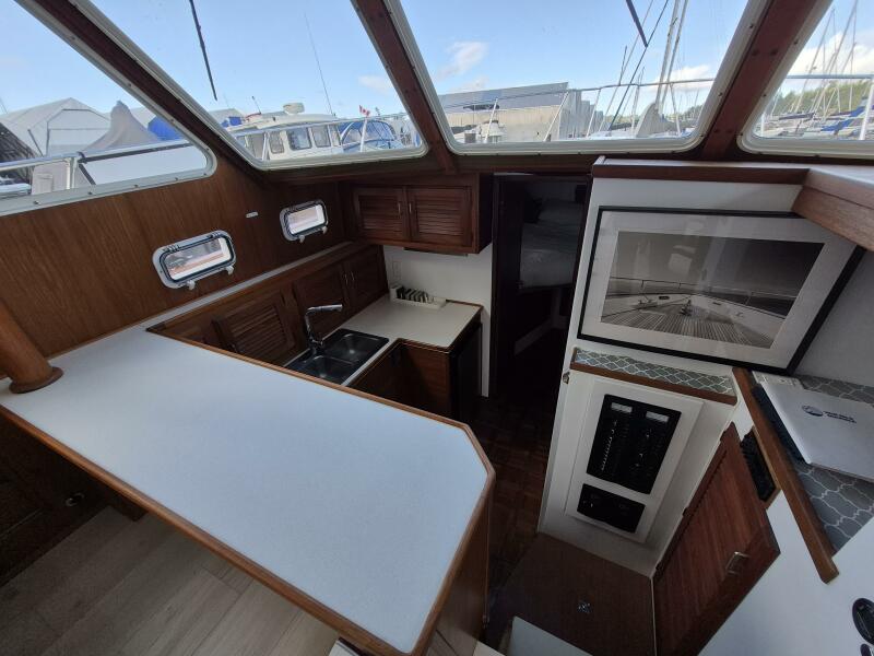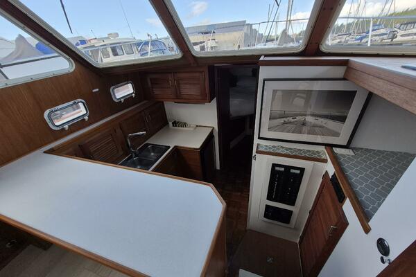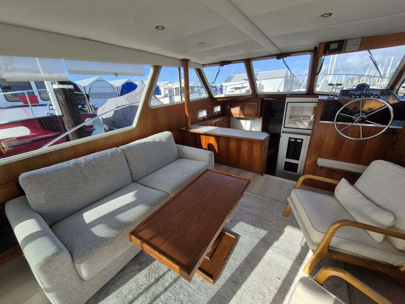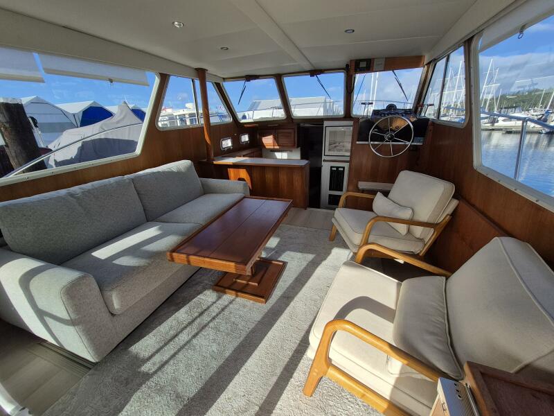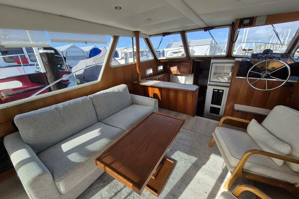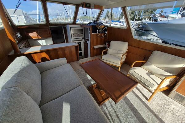 - Spacious Interior: Enjoy a roomy salon with ample seating, rich wood finishes, and large windows for panoramic views. The layout includes a comfortable master stateroom, a well-appointed galley, and a versatile guest area with a new double sofa bed.