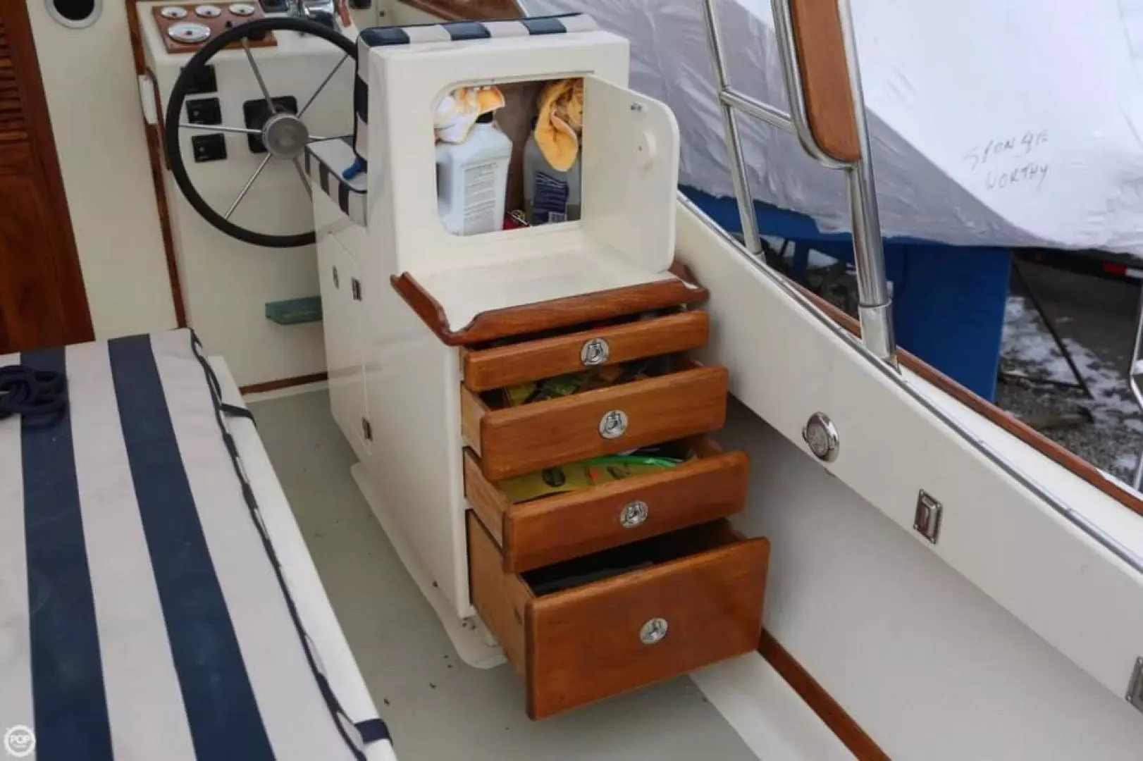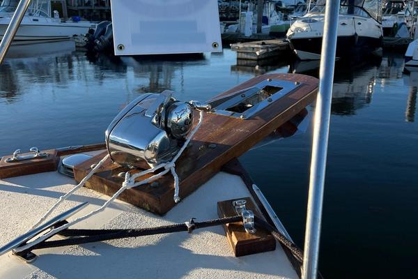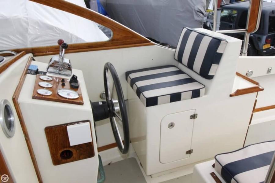Her hull features a fine bow and narrow entry forward which helps reduce pounding and improves maneuverability in short choppy seas. There is ample flare forward and a full-length, molded spray rail that runs along the chine from the stem to the transom to keep the boat and crew dry. Her The 10' beam is considerable for a 26' boat of this vintage and gives her the feeling of a much larger boat. A molded keel runs nearly the full length of the boat and adds to the boat's directional stability as well as provides excellent protection for the shaft, propeller, and rudder. The rudder is supported on the bottom by a cast bronze shoe that extends from the keel.