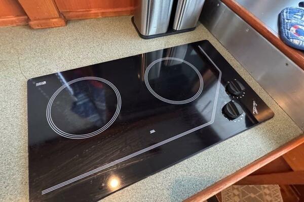 Electrical system upgrades ensure dependable operation and modern energy efficiency, including a lithium battery bank and high-output inverter. The combination of shore power, generator, and inverter allows for quiet anchoring and energy independence.