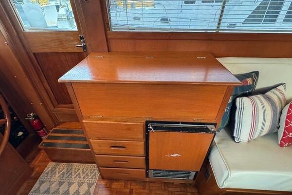 Entering through either of the two salon side doors, the main salon is bright and inviting, featuring a warm teak interior with custom blinds, new headliner, and LED lighting on dimmers. To port, the galley includes a Force10 cooktop, Norcold refrigerator, U-Line wine cooler, Origo microwave, and stainless sink with ample storage. To starboard, the lower helm provides excellent visibility and access to both side decks, with a classic Grand Banks teak wheel. Aft of the helm is a bar cabinet and small writing desk, while the L-shaped settee to starboard surrounds the original leaf table—perfect for dining or entertaining.