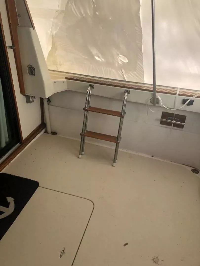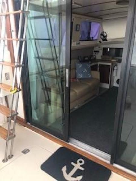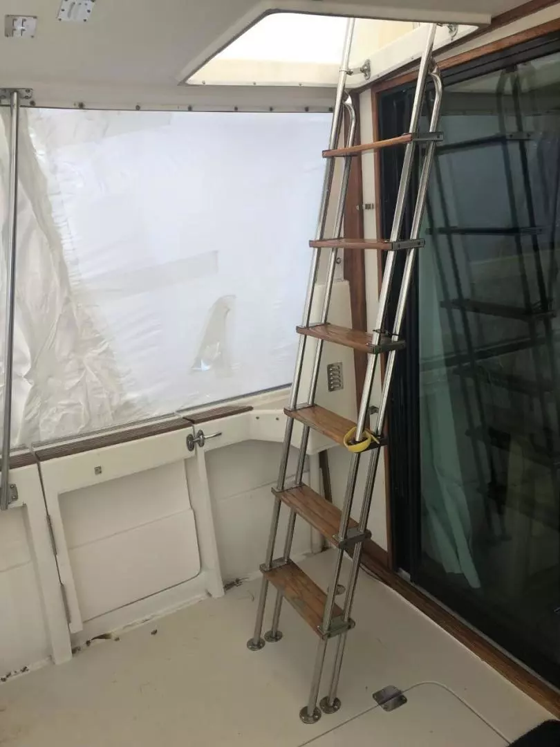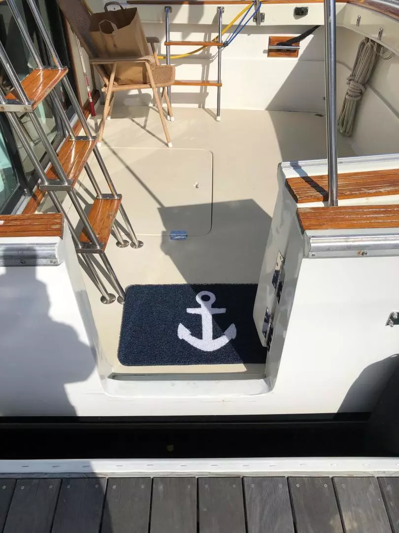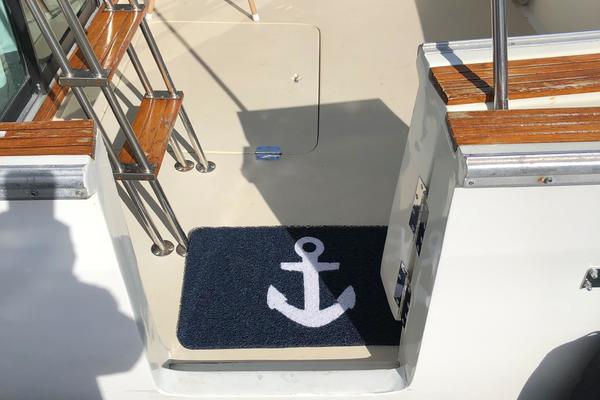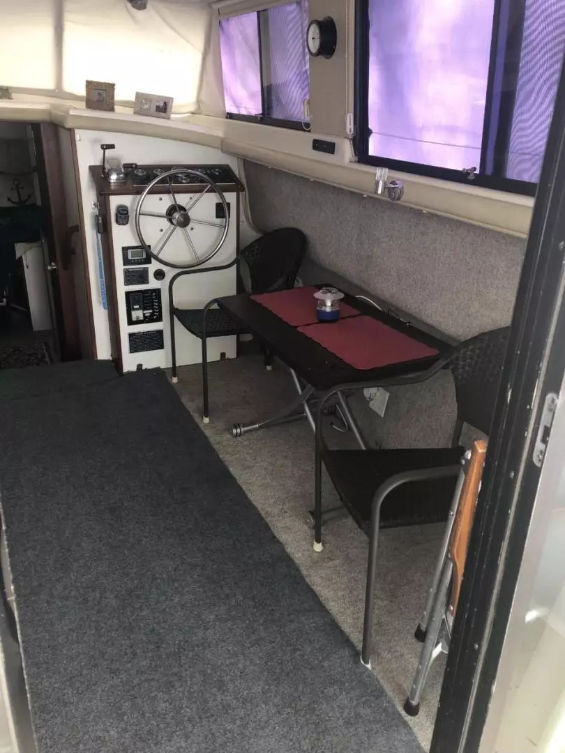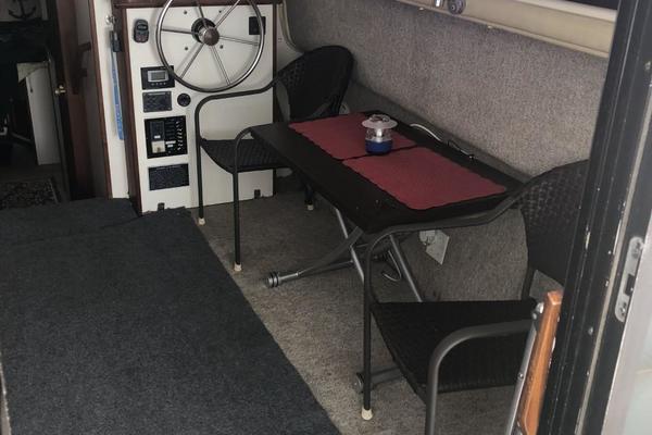 The master stateroom is forward with a V-berth configuration and a filler cushion. Aft to starboard is the head with a separate stall shower. Opposite the head and down is the spacious galley area. Up a couple of steps to the salon with the lower helm to starboard, fold out sofa to port with chairs and a table to starboard. Up on the flybridge you have another helm with passenger seating