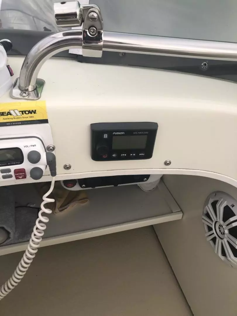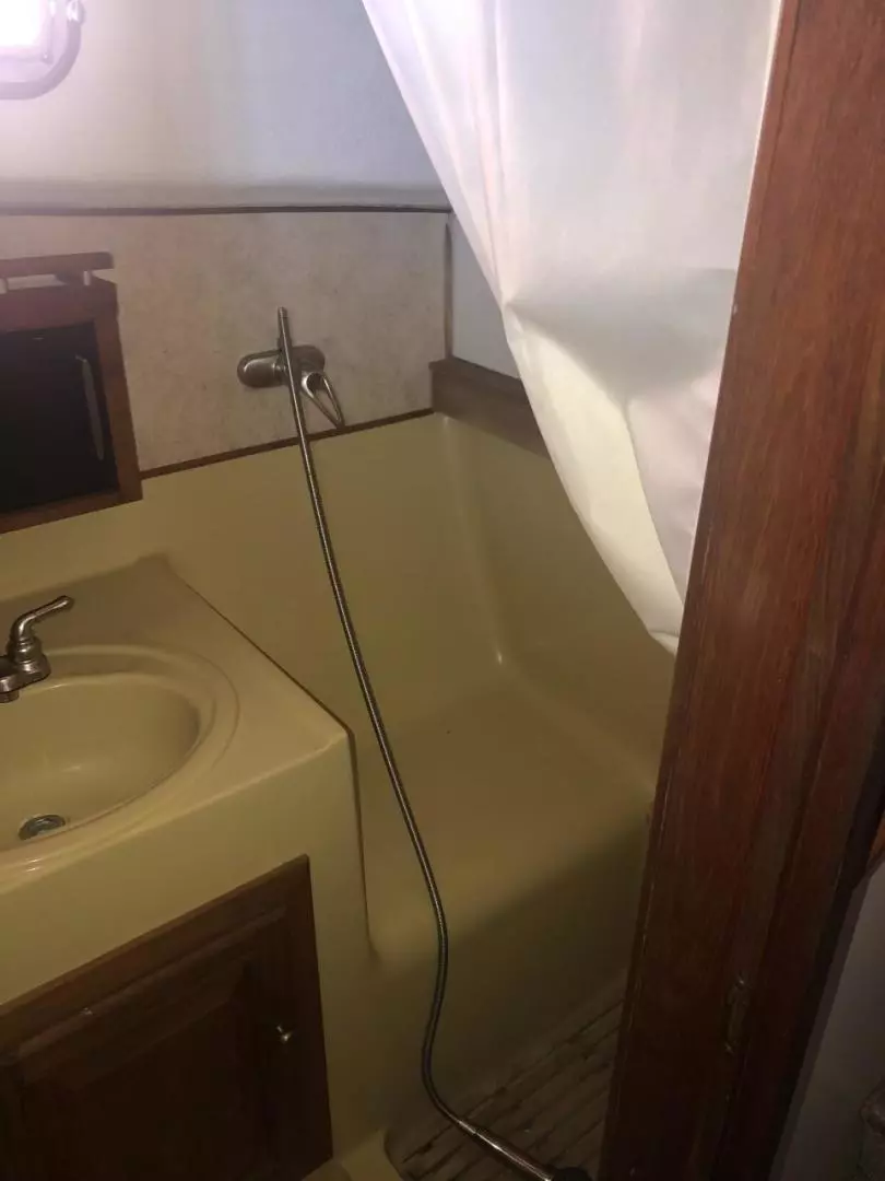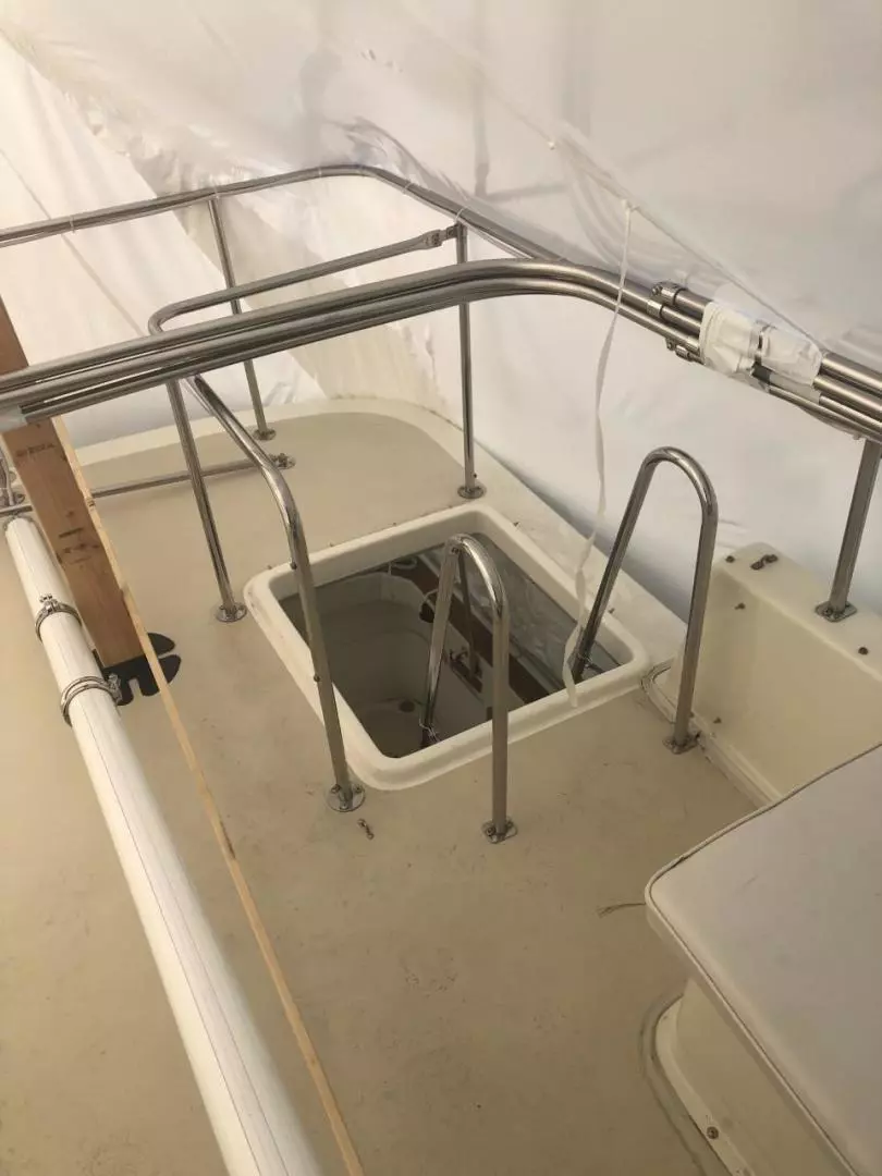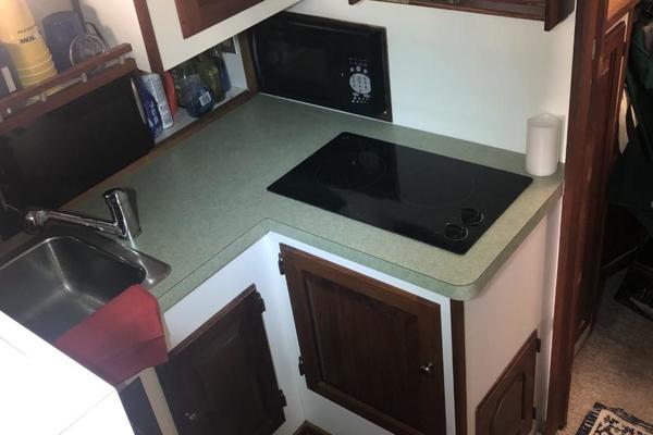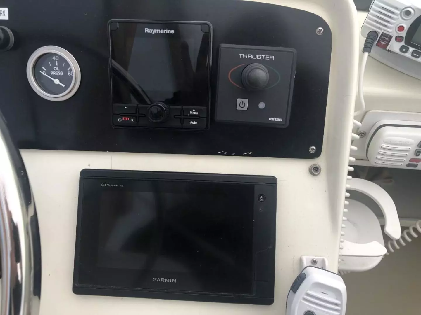The master stateroom is forward with a V-berth configuration and a filler cushion. Aft to starboard is the head with a separate stall shower. Opposite the head and down is the spacious galley area. Up a couple of steps to the salon with the lower helm to starboard, fold out sofa to port with chairs and a table to starboard. Up on the flybridge you have another helm with passenger seating