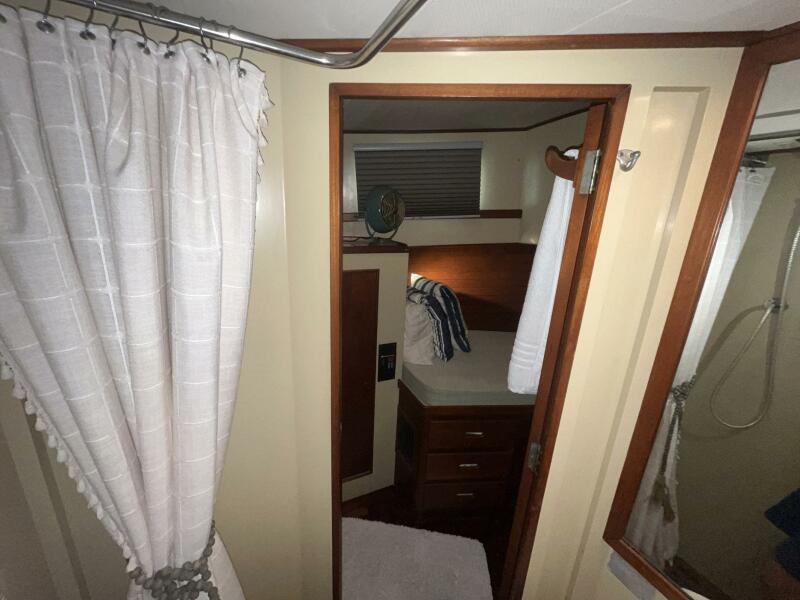 The guest head on Chosen Sun is to starboard in the Guest Stateroom. It has a full door for privacy. The entire sole is a teak grate. There is a shower curtain to separate the shower area. There is a molded counter and sink below a window with a room-darkening honeycomb blind (2023). There is storage both under and over the vanity, and a towel bar mounted on the door. The removable shower head and sink faucet were replaced in 2023. The electric toilet is attached to an Electra Scan system. A wall-mounted mirror is next to the sink. Access to the lower helm station electrical connections is through a cabinet in the bulkhead.
