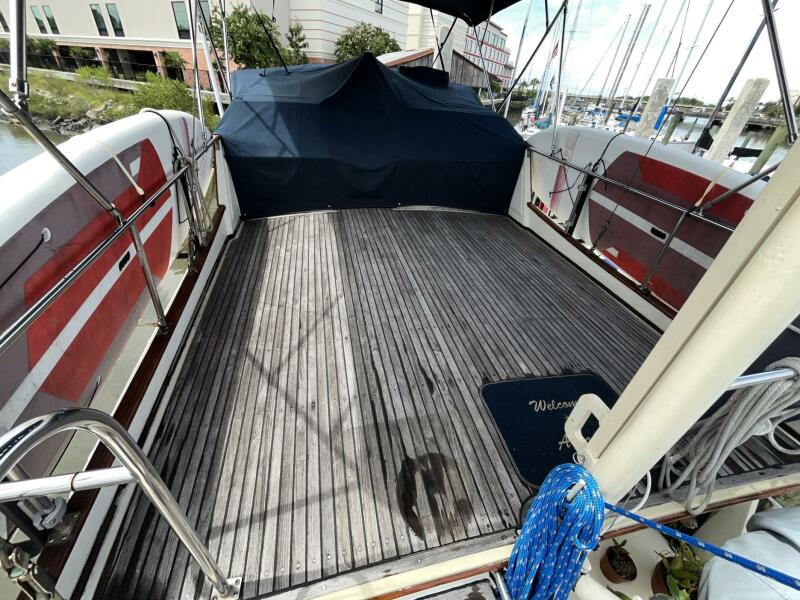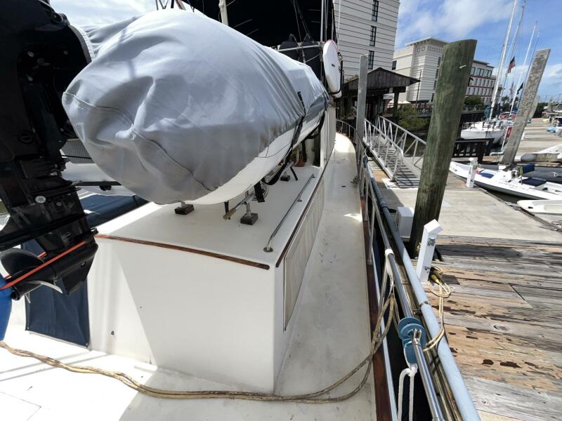 The tender is stored on the trunk deck. The mast/tender davit with winch was rebuilt in 2025. The block and tackle were replaced at the same time. The trunk deck also has a hatch with a dark blue Sunbrella cover, which allows access to the master stateroom. There is a storage lazarette in the deck aft. A covered Magma grill is mounted on the aft rail.