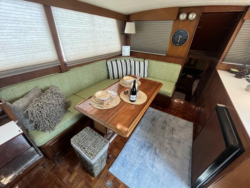 The L-Shaped settee, to starboard, is a light green fabric. The cushions and the fabric were all replaced in 2023. There is tremendous storage, as expected of a Grand Banks, under the settee. One of the highlights of the salon on Chosen Sun is the beautiful and versatile drop-leaf dining table. The center of the top opens to reveal storage; there are small hidden drawers on both sides for storage; the base features both bottle storage and magazine/book storage.