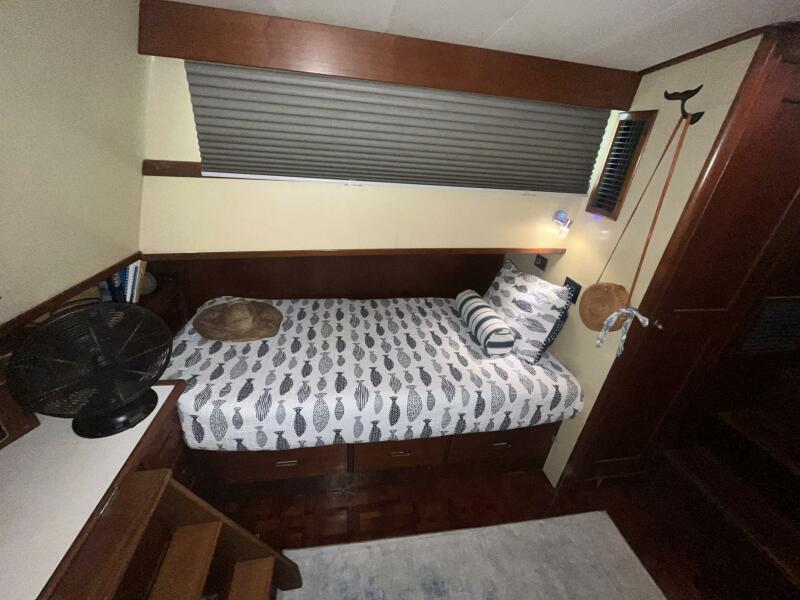 The en-suite guest stateroom on Chosen Sun is the V-Berth forward of the salon. There are four steps down, which can be removed to access the engine room. There is a privacy hatch/door. The V-Berth fabric matches the salon. The V-Berth cushions and fabric were replaced in 2023. There are two reading lights which were replaced in 2024.