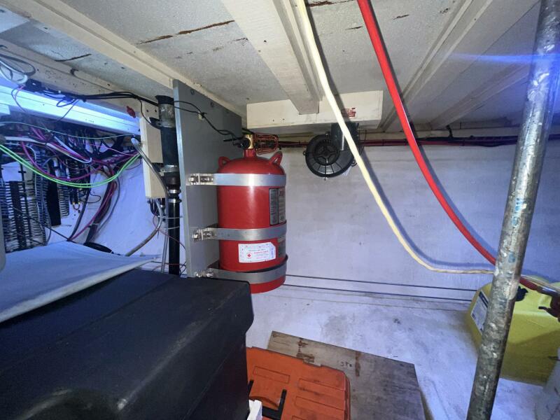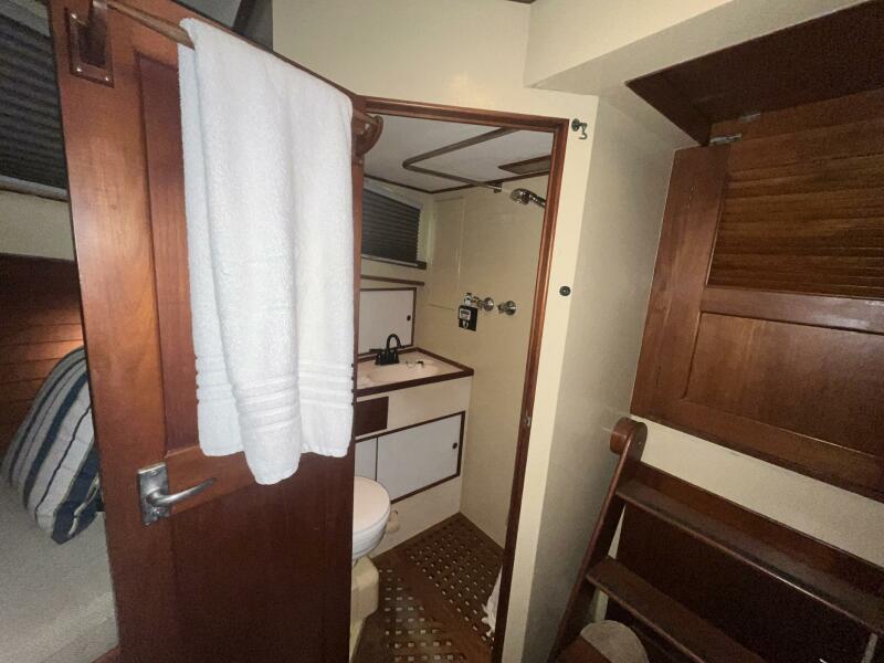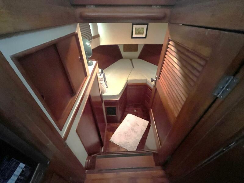 Access to the anchor locker is forward. Access to the forward area of the engine room is under the stairs down from the salon. The en-suite head is to starboard.