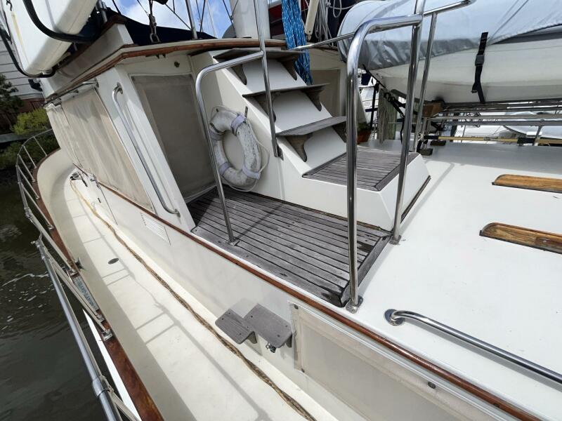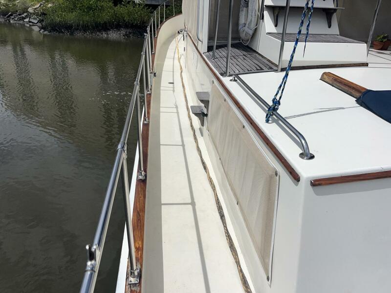 Chosen Sun is a “trunk-style” trawler with a full walk-around deck. This aids in maneuverability for line handling. The original teak decks were removed in 1998 and replaced with fiberglass with non-skid paint. The toe-rail is varnished teak. There is no wood on the handrail. The steps leading to the flybridge are natural teak, as is the sole of the flybridge.