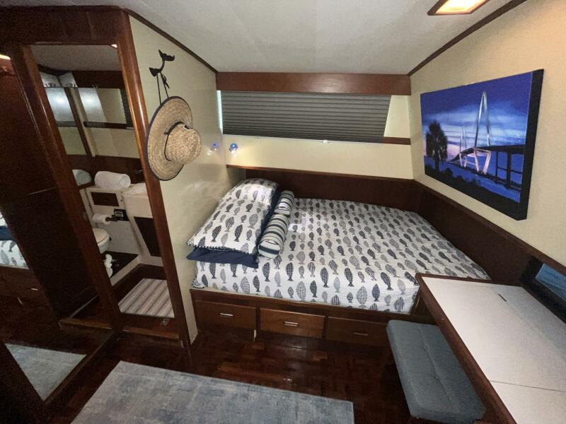 The full-beam, en-suite, master stateroom on Chosen Sun is aft. It is four steps down from the salon and has a privacy hatch/door. The sole is highly glossed teak parquet. The master stateroom can also be accessed from the deck using a hatch and step ladder, which latches out of the way for convenience. A full berth (54 in. x 75 in.) is located to starboard. A single berth (42 in. x 75 in.) is located to port. Both mattresses were replaced in 2023. The berths are separated by a dresser with drawers and a make-up cabinet with a stool. This area would be ideal to use as a workspace if needed.