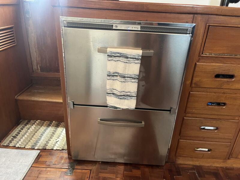 Across from the settee, to port, is a large storage area. There is a full-length strip of electrical outlets, which is handy for the many electronic devices in use today. The counter would make an ideal space for a television, if the new owner wants to add one. A counter-height U-Line refrigerator with a small freezer compartment is located forward in the storage area.
