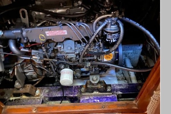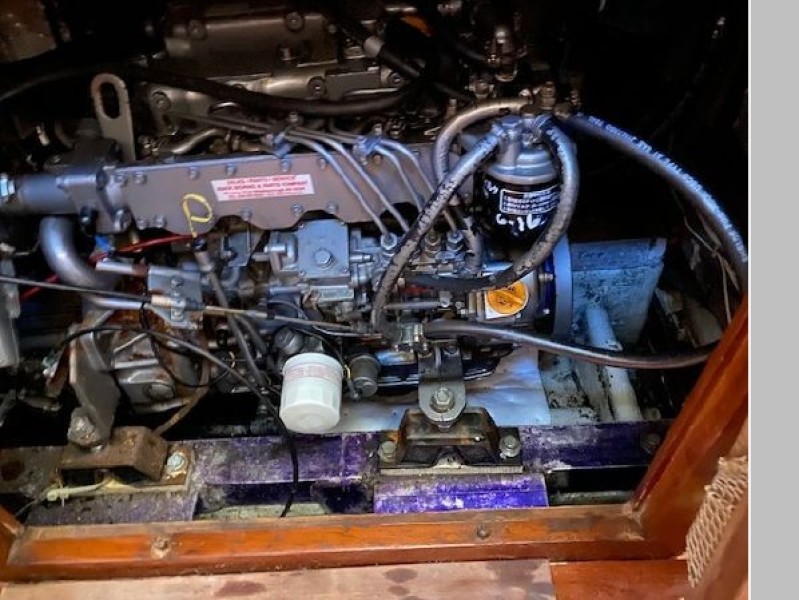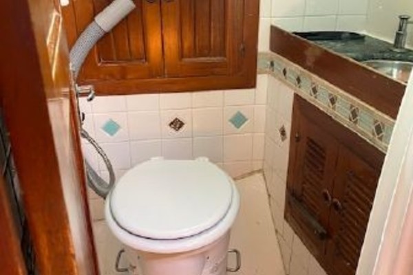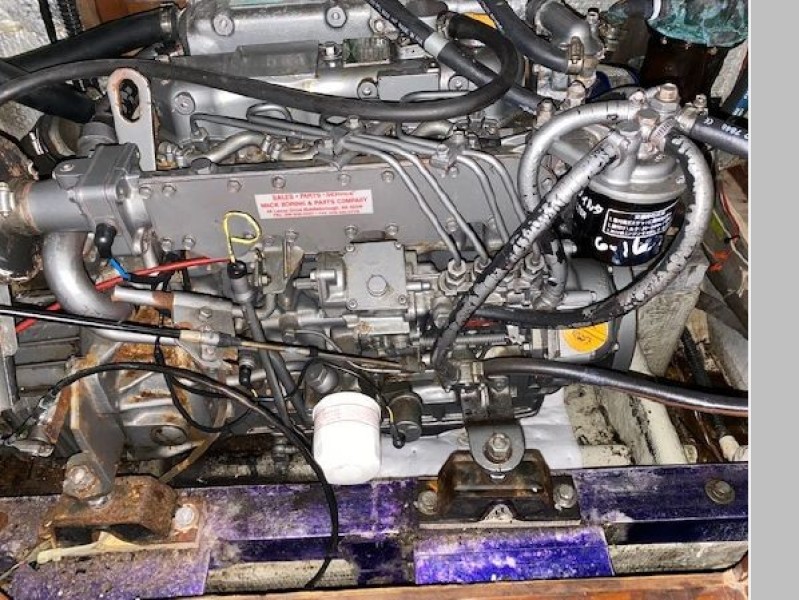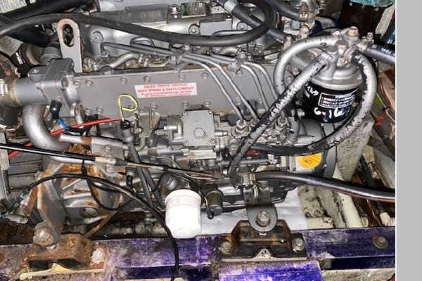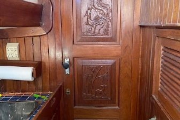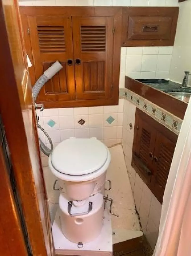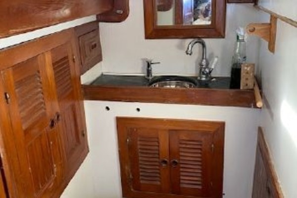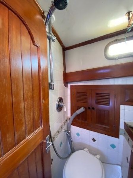 The aft head has been completely refurbished and shows nearly new. It is accessed from the aft cabin port side, with new solid teak flooring, ample cabinet storage, and updated modern fixtures. Access panel to port side of engine. New 30g holding tank installed.