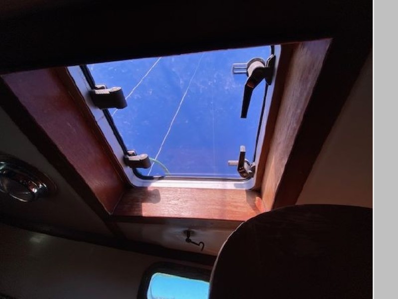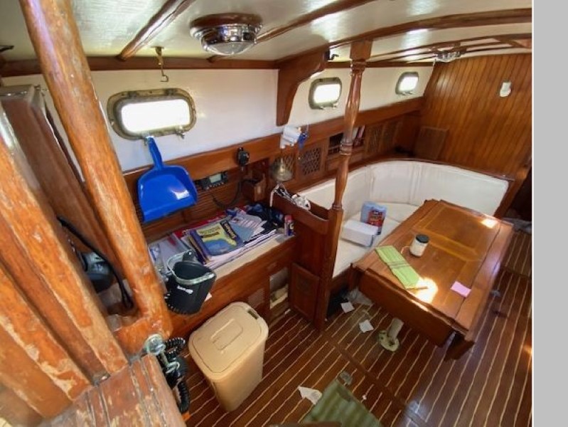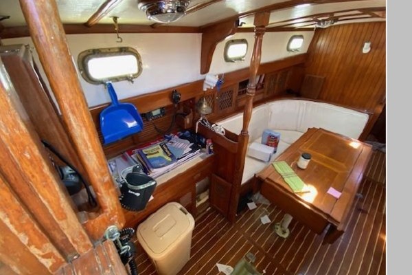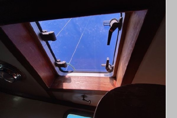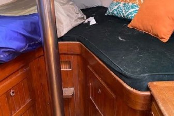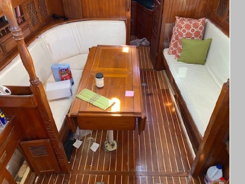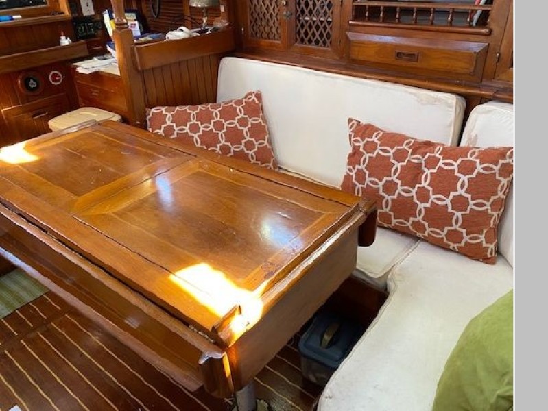 L-shaped dinette to port with a settee to starboard that pulls out to form a double berth. The large drop-leaf center-line dining table has a sliding top panel to access storage inside the table. There are locker spaces behind both settees as well as double lockers above. Four opening ports and an overhead butterfly hatch let in plenty of light & air. New cushion upholstery in 2017.