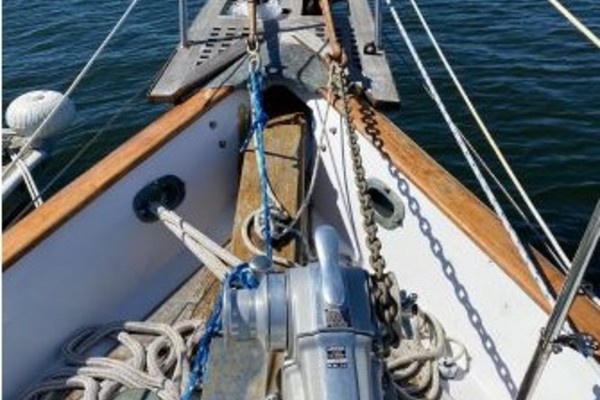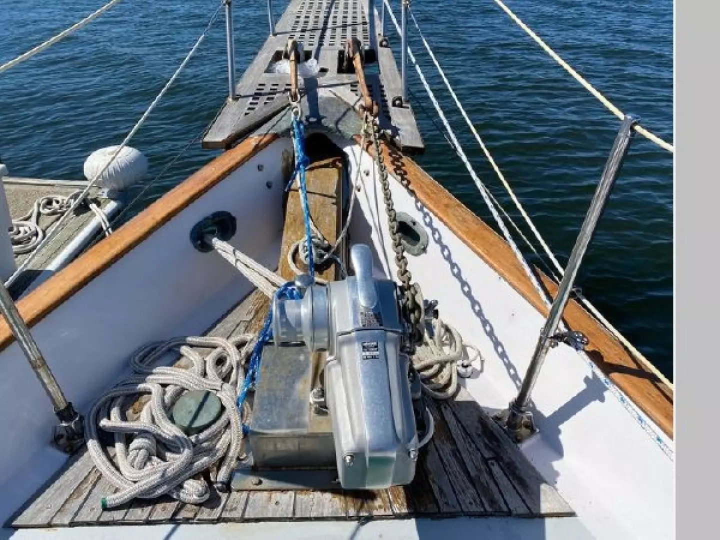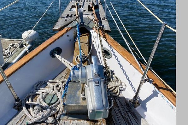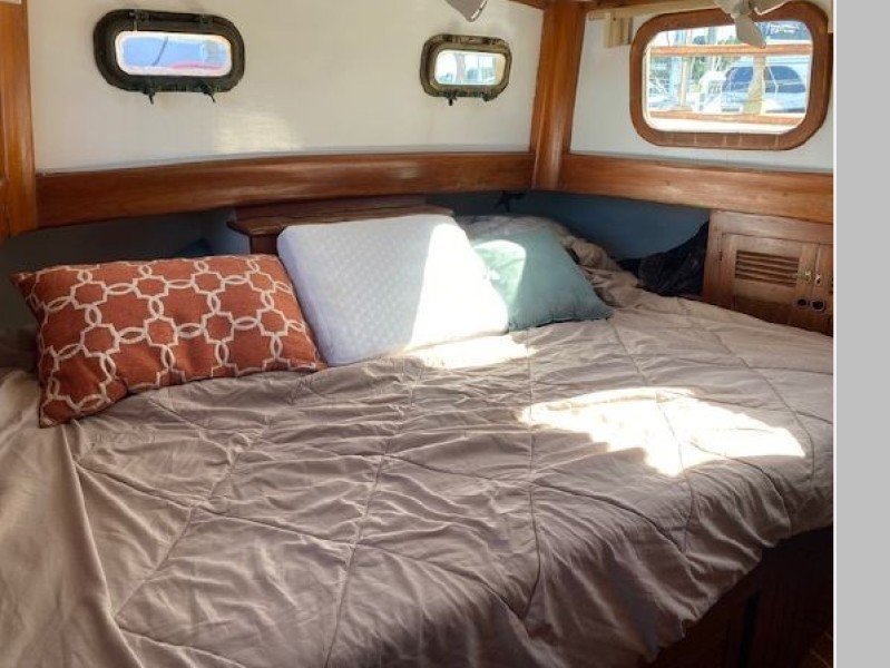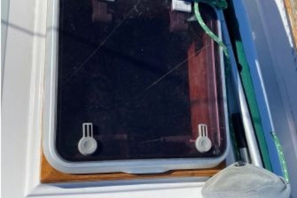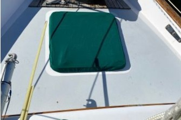 Large V-berth forward with storage shelving along each side and drawers underneath. There is a hanging locker and other storage compartments just aft of the berth. Two new overhead hatches and two opening ports let in plenty of light and air. The chain locker is forward of the berth.
