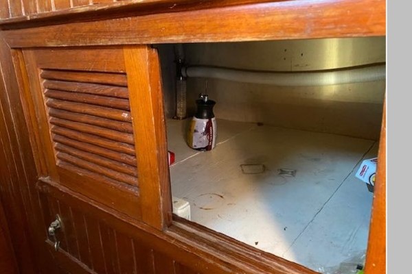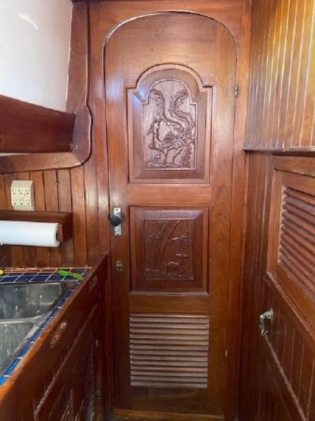 The Galley is located aft of the main saloon along the starboard walk-way leading into the aft cabin. Storage is located in lockers behind the entire length of the galley as well as lockers above the engine room. There is access to starboard side of the engine in the galley area
