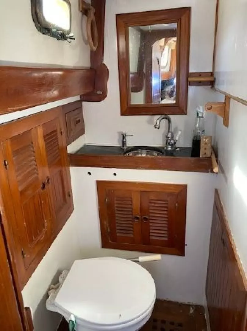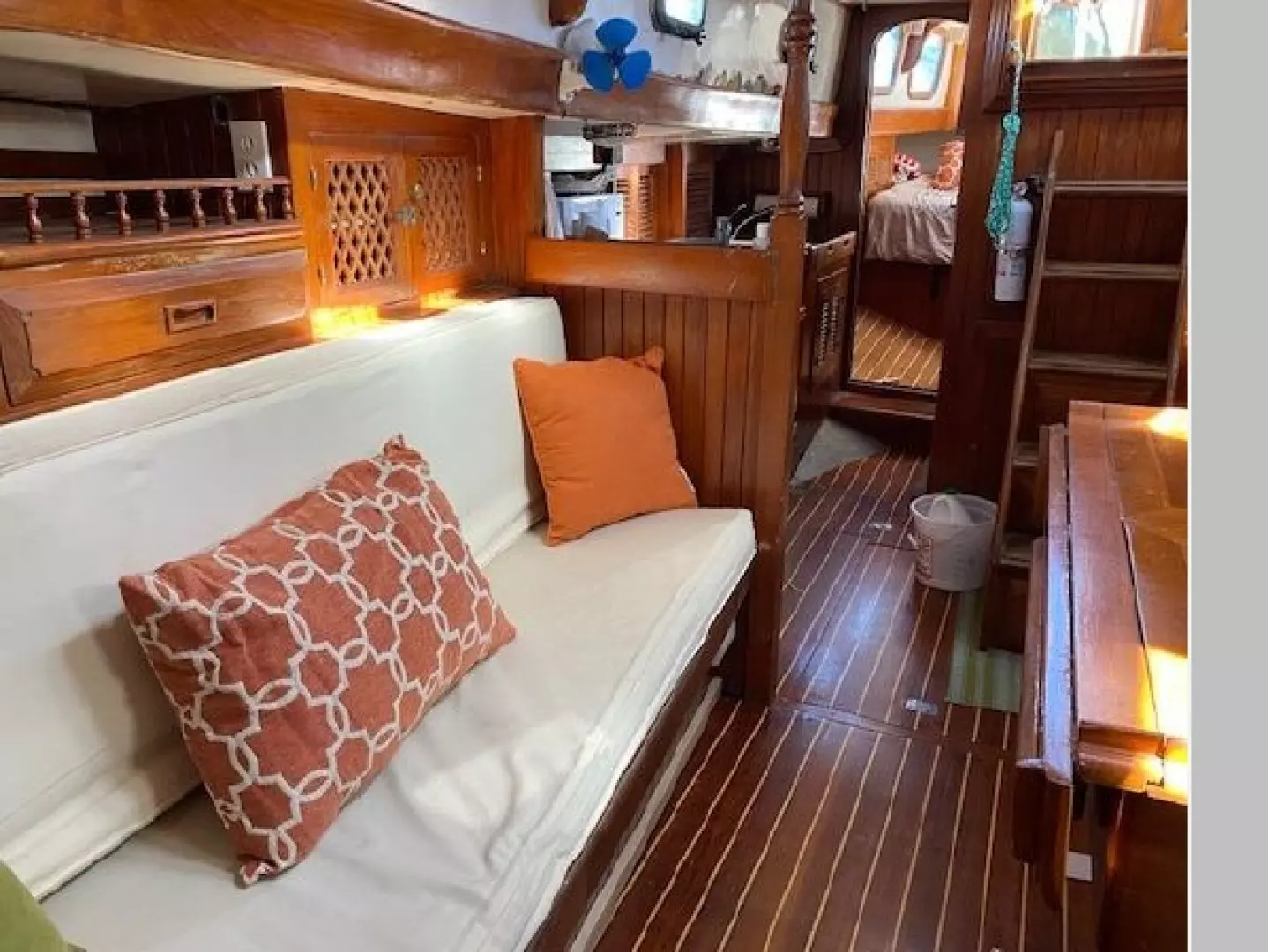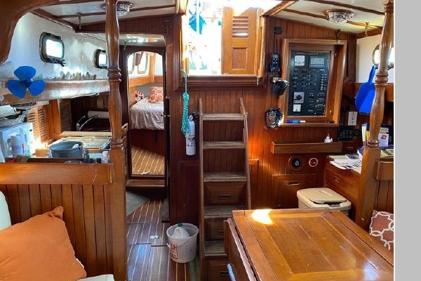 Sabine features a beautifully hand-crafted teak interior with two private cabins, a large main saloon, full galley, spacious engine compartment, two heads, and massive storage capacity. LED lighting throughout and plenty of light and air. Cabin sole replaced with teak & holly.