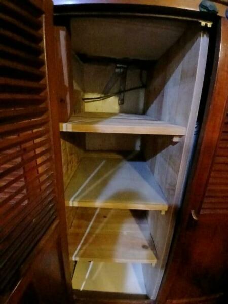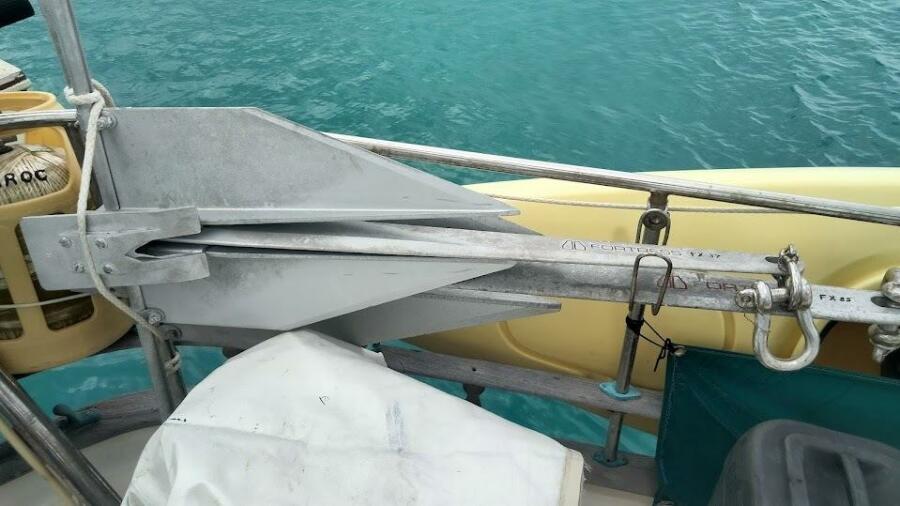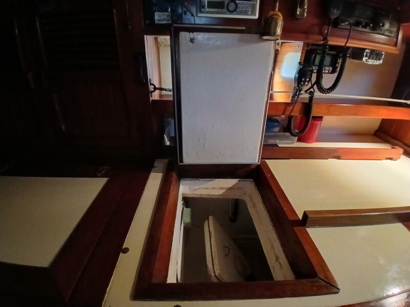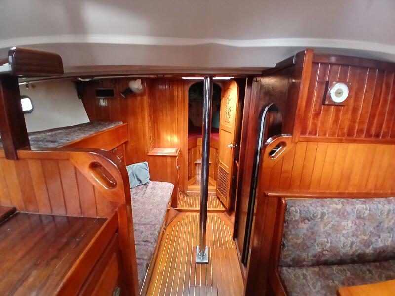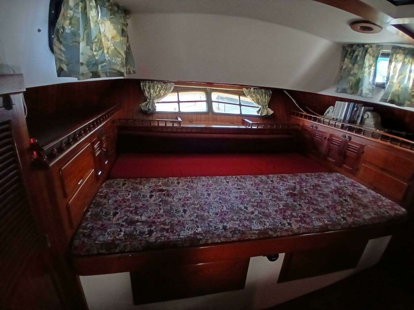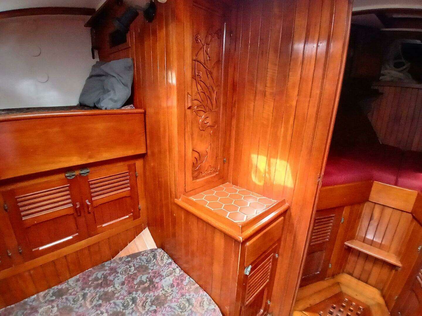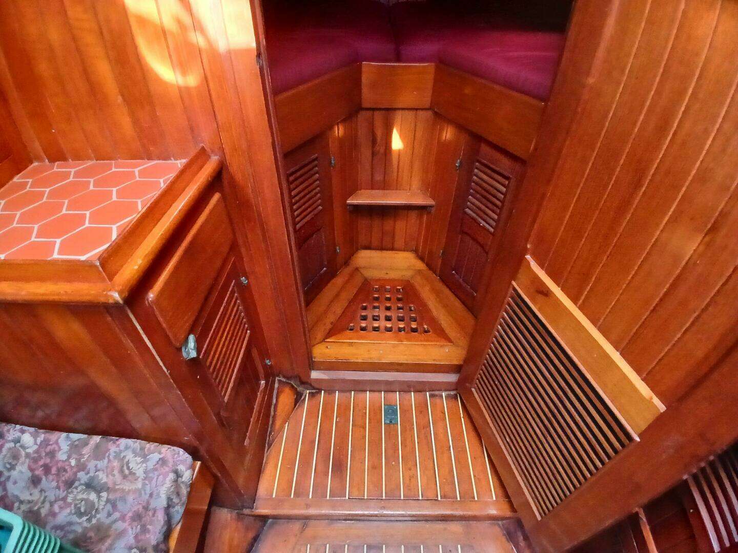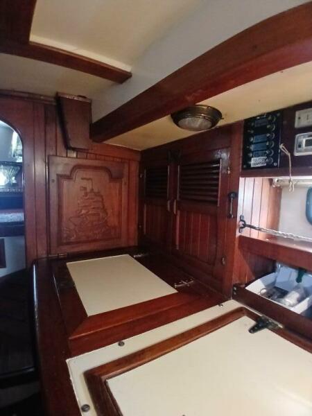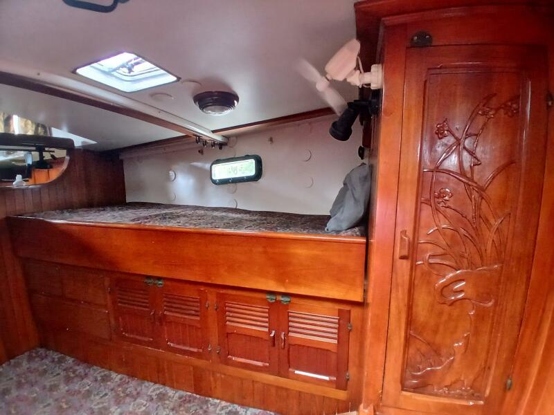 Forward towards the bow there is a spacious V-Berth with a beautifully carved door for privacy. There are lockers and shelves on both sides and a hatch large enough to pass sails through. V-berth cushions are covered in burgundy sunbrella, and underneath them is even more storage. The anchor locker is just forward of the V-Berths with great access via double doors towards the bow.