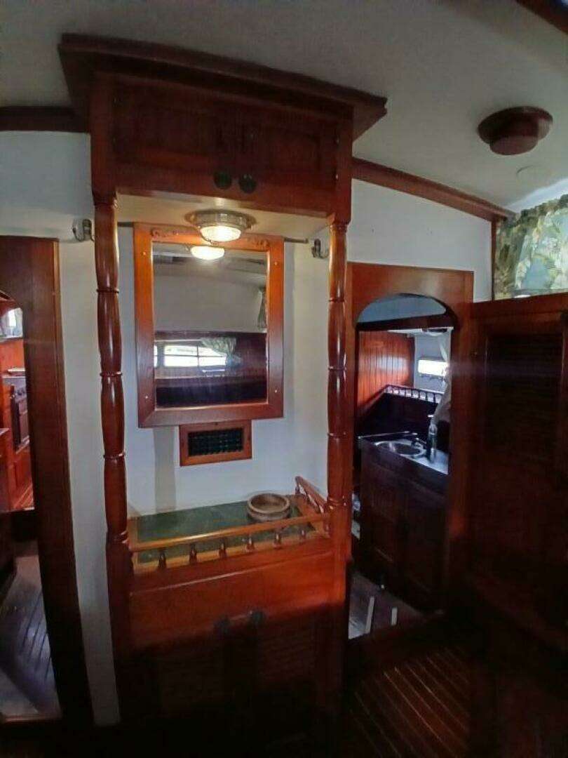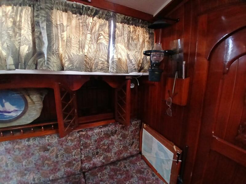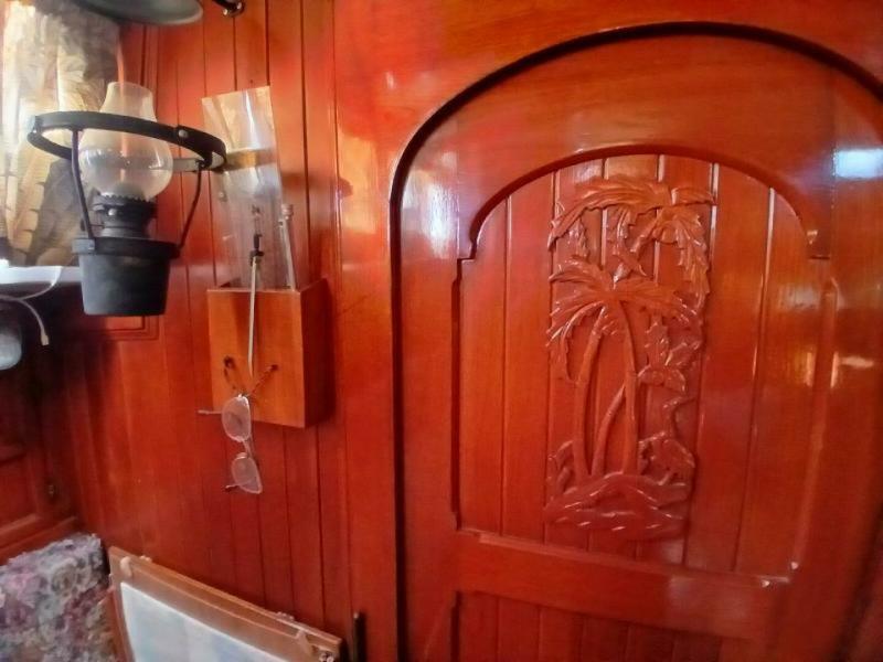 Stepping down the companionway of Lady Bella, her incredible interior welcomes you with stunning varnished teak carpentry throughout, from the solid teak cabin soles to dreamy carvings of sailing ships and palm trees accenting the doors. It's worth noting that in every cabin Hardin perfected what most designers can’t grasp even today-that is luxuriously spacious living quarters AND an unbelievable amount of storage!