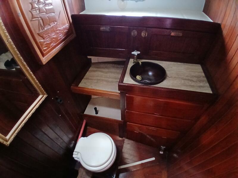 This full head to starboard can be accessed both from the Salon and the Master Stateroom. There are two ports for ventilation as well as two doors for starboard engine access. This head has a separate shower, marble counters, and varnished teak throughout.