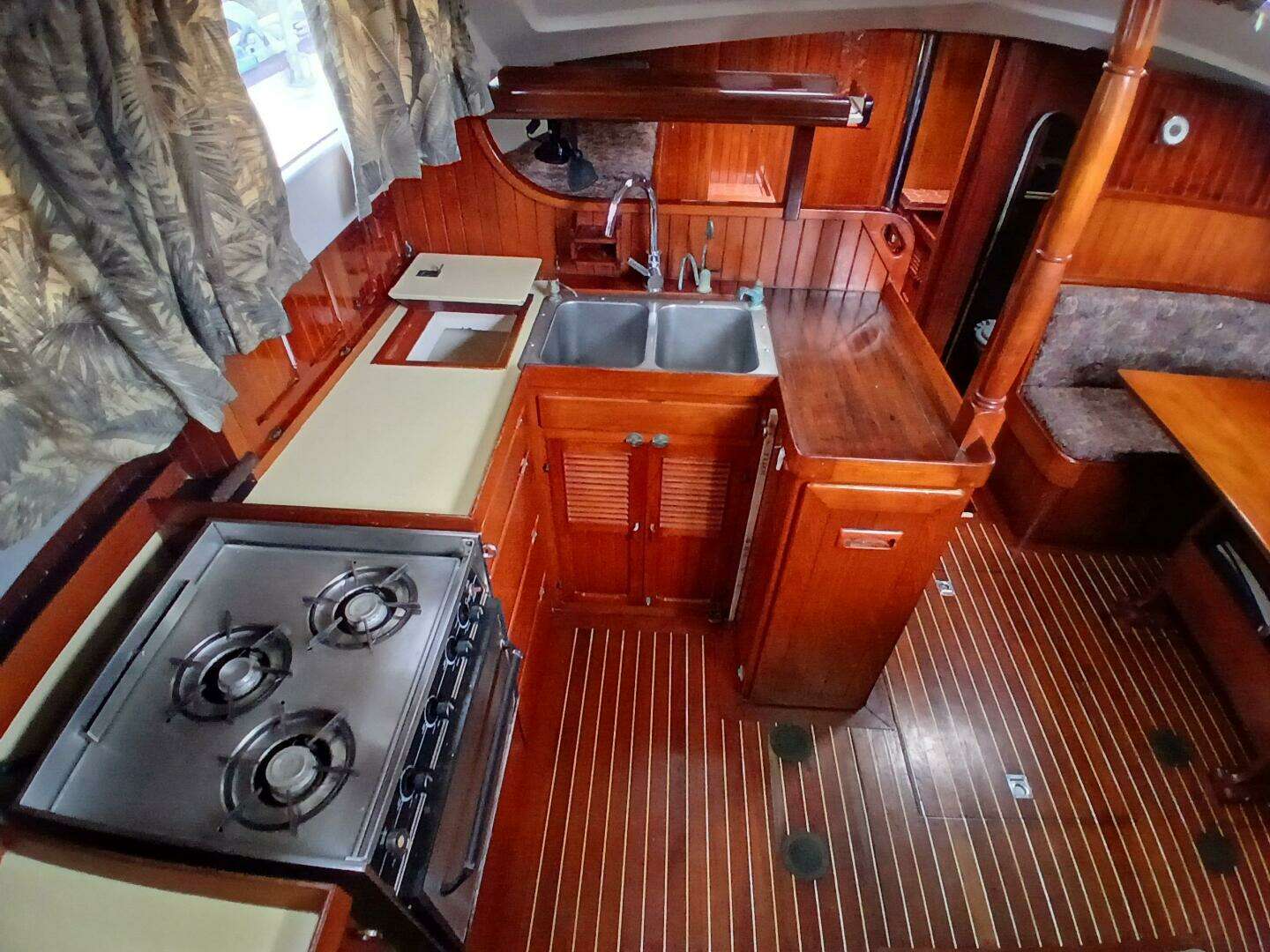 To port of the Companionway, the Galley is well thought out and efficient, with plenty of counter space, storage, and a convenient pull-out drawer by the sink that allows for a U shape space for stability while prepping meals in rough seas.