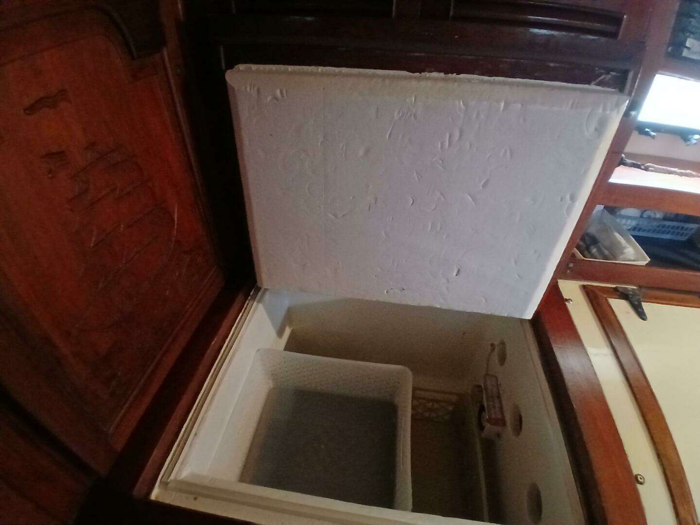 Moving aft from the galley on the port side there is a hallway with two large fridge and freezer boxes built into a long counter, as well as the nav station and 3 doors to access the engine and generator.