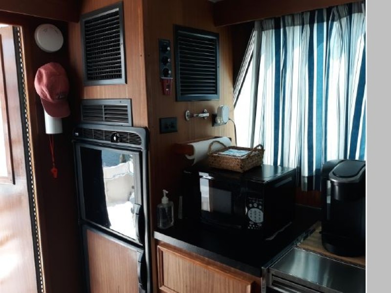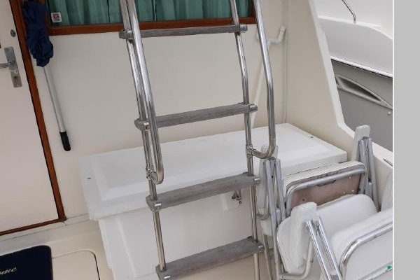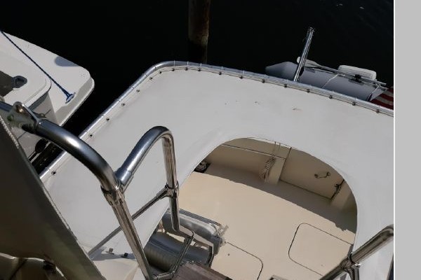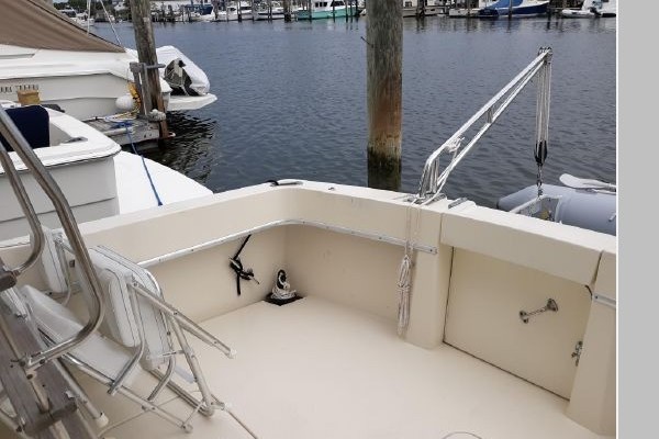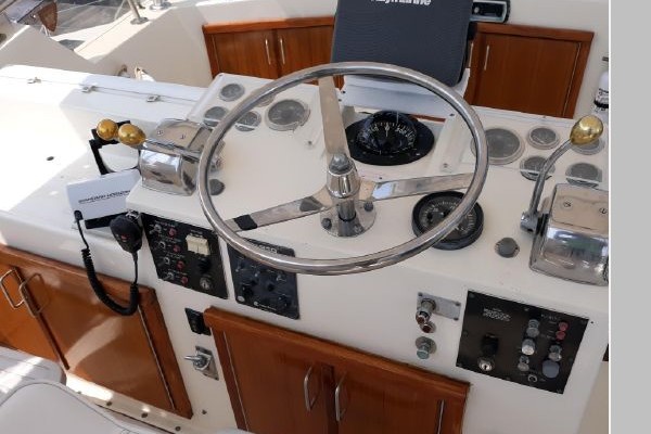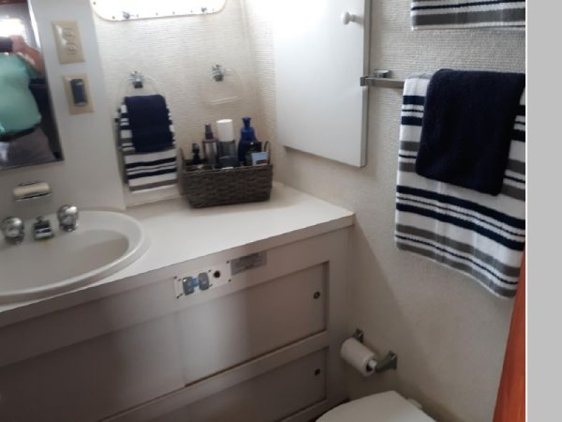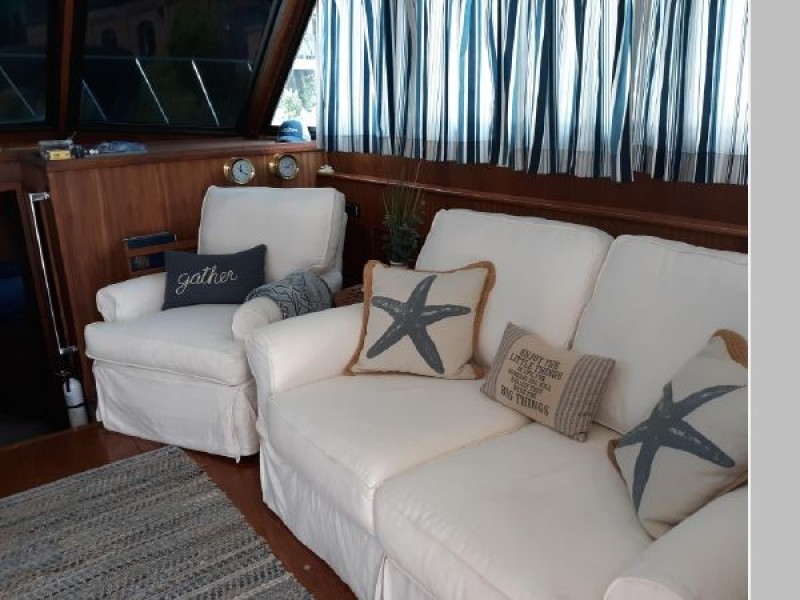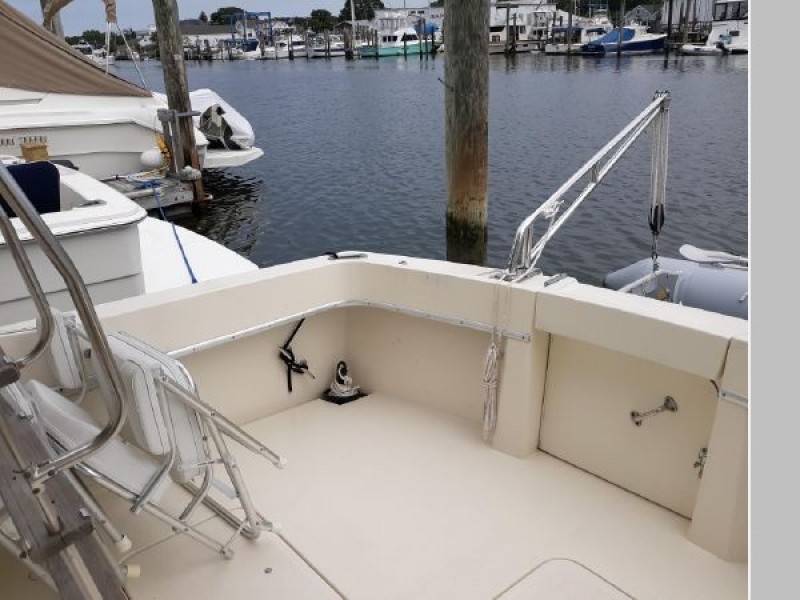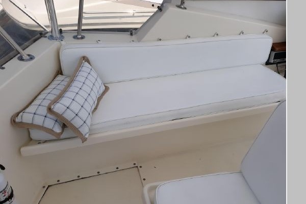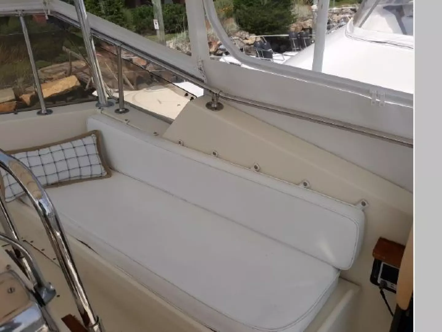 Forward in the V-Berth you have an offset double bed to starboard and a single bed to port, hanging locker and a ventilation hatch. Aft to port is the head with a separate stall shower, head, vanity and mirror. Aft to starboard is the second stateroom with upper and lower berths. Up a couple of steps to the salon area with the full galley to port and sofa and lounge chair to starboard. Full windows provide plenty of natural light and a flat screen TV. Out to the cockpit area where you have a transom door providing access to the swim platform. Up on the flybridge you have a center helm with 2 Captains Chairs, bench seat forward of the helm and a lounge seat to starboard.