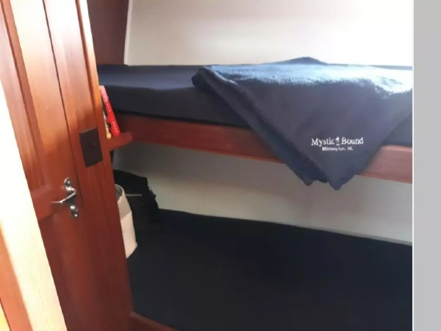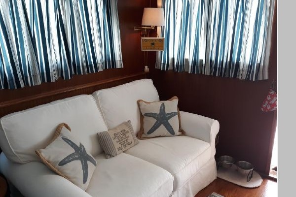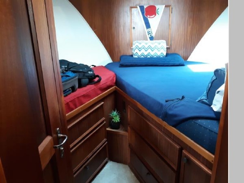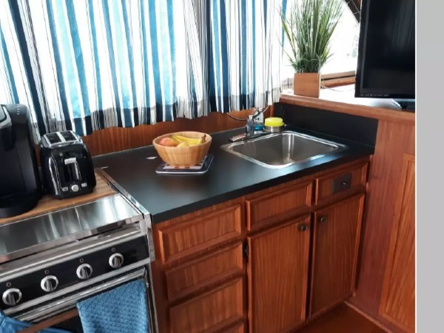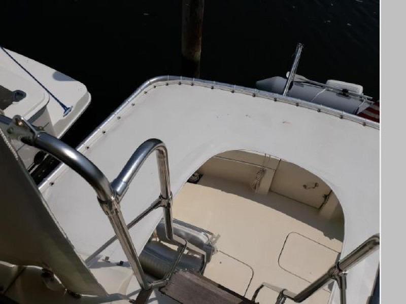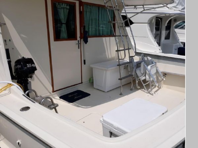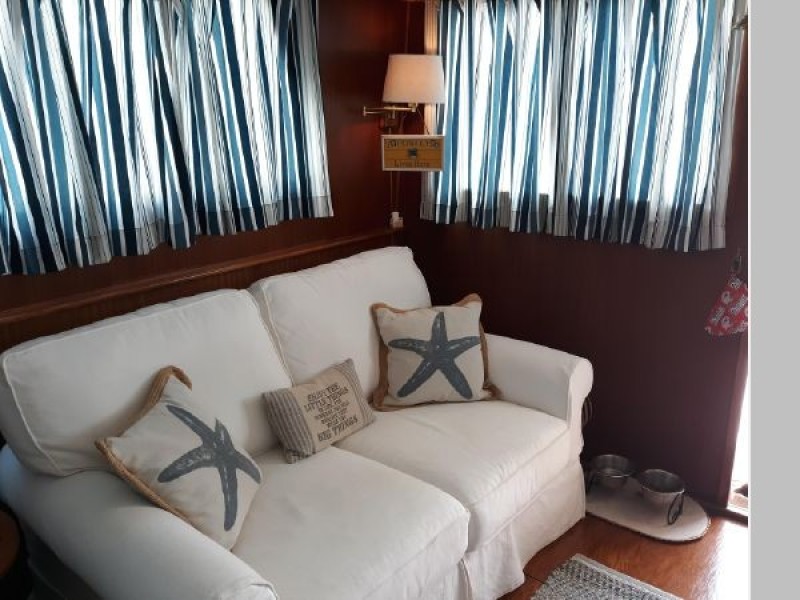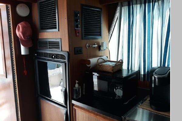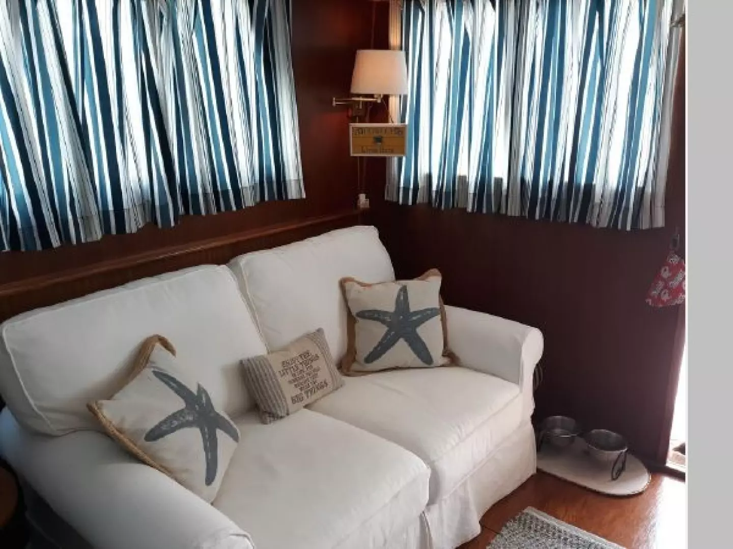 Forward in the V-Berth you have an offset double bed to starboard and a single bed to port, hanging locker and a ventilation hatch. Aft to port is the head with a separate stall shower, head, vanity and mirror. Aft to starboard is the second stateroom with upper and lower berths. Up a couple of steps to the salon area with the full galley to port and sofa and lounge chair to starboard. Full windows provide plenty of natural light and a flat screen TV. Out to the cockpit area where you have a transom door providing access to the swim platform. Up on the flybridge you have a center helm with 2 Captains Chairs, bench seat forward of the helm and a lounge seat to starboard.