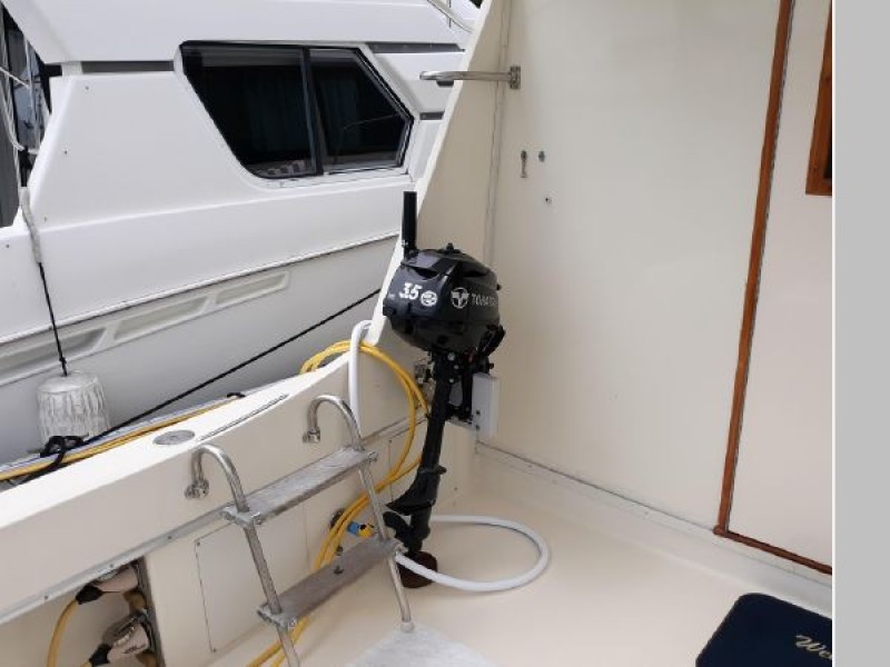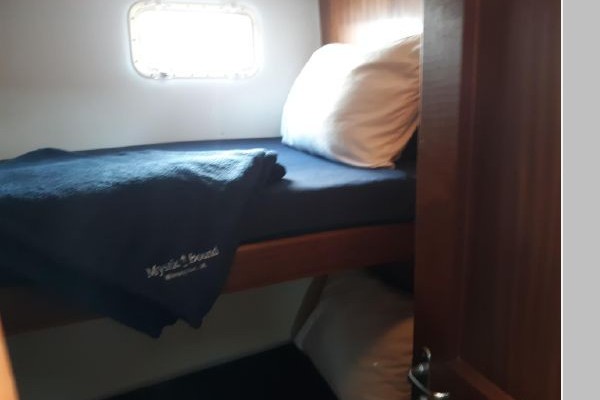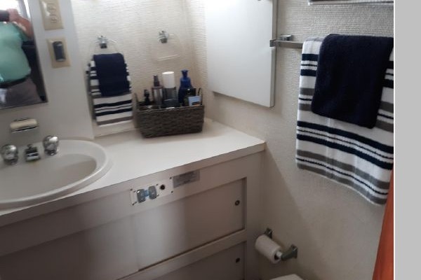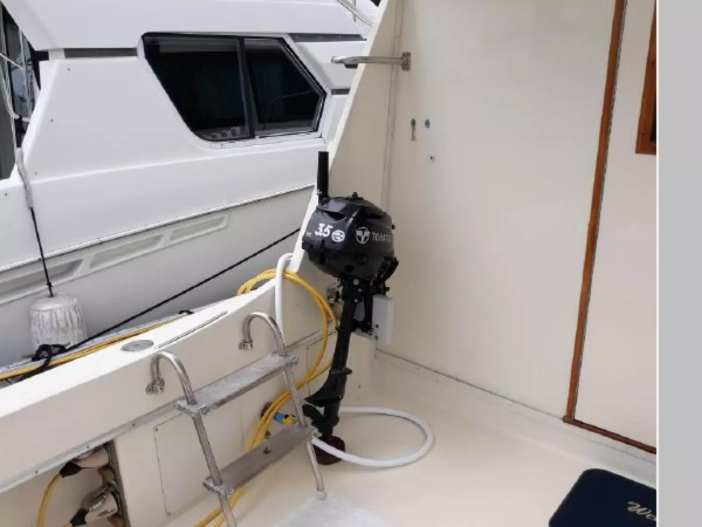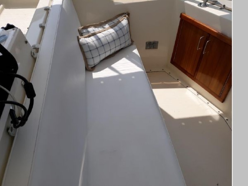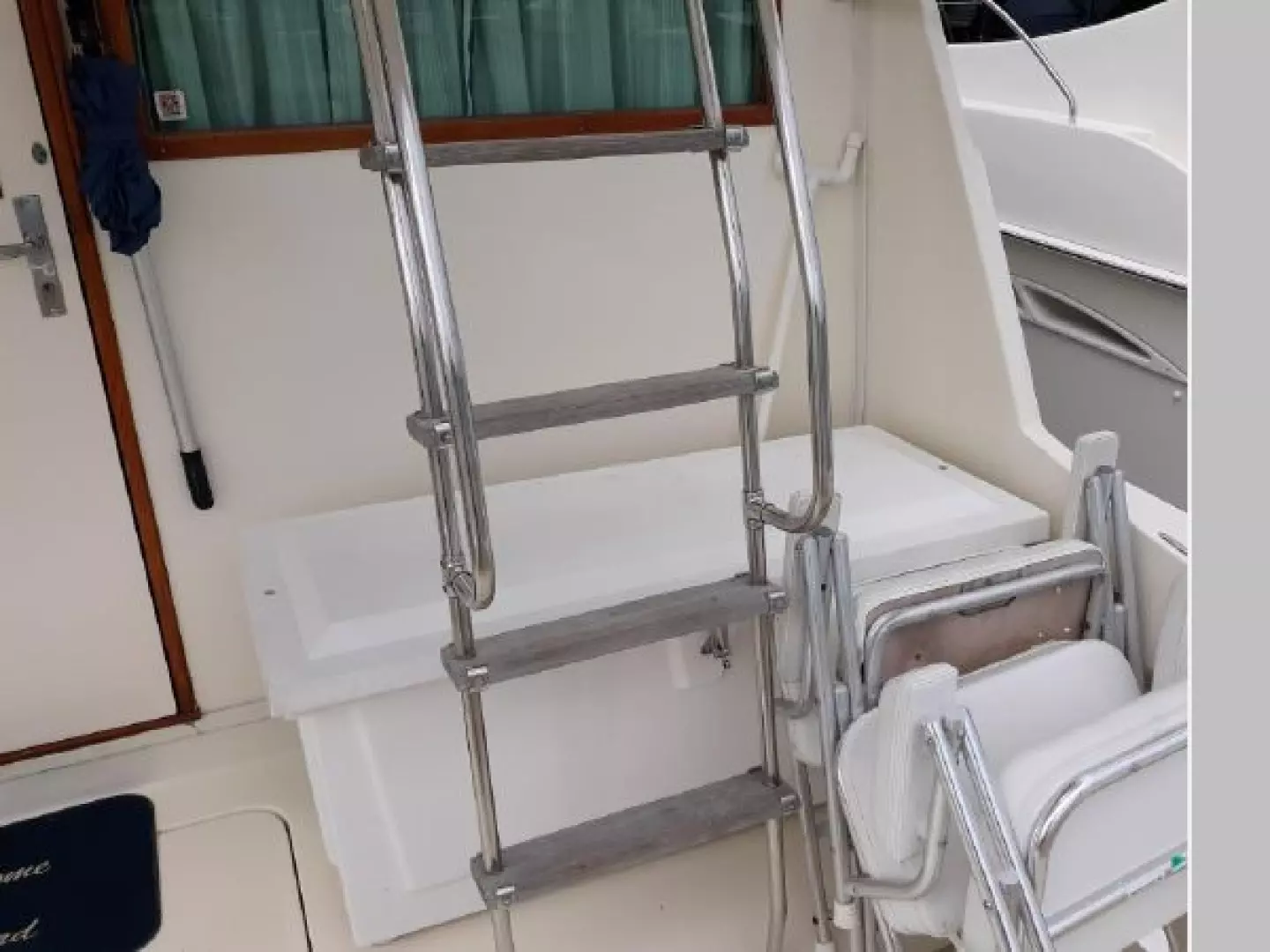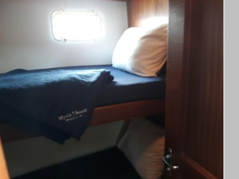 Forward in the V-Berth you have an offset double bed to starboard and a single bed to port, hanging locker and a ventilation hatch. Aft to port is the head with a separate stall shower, head, vanity and mirror. Aft to starboard is the second stateroom with upper and lower berths. Up a couple of steps to the salon area with the full galley to port and sofa and lounge chair to starboard. Full windows provide plenty of natural light and a flat screen TV. Out to the cockpit area where you have a transom door providing access to the swim platform. Up on the flybridge you have a center helm with 2 Captains Chairs, bench seat forward of the helm and a lounge seat to starboard.